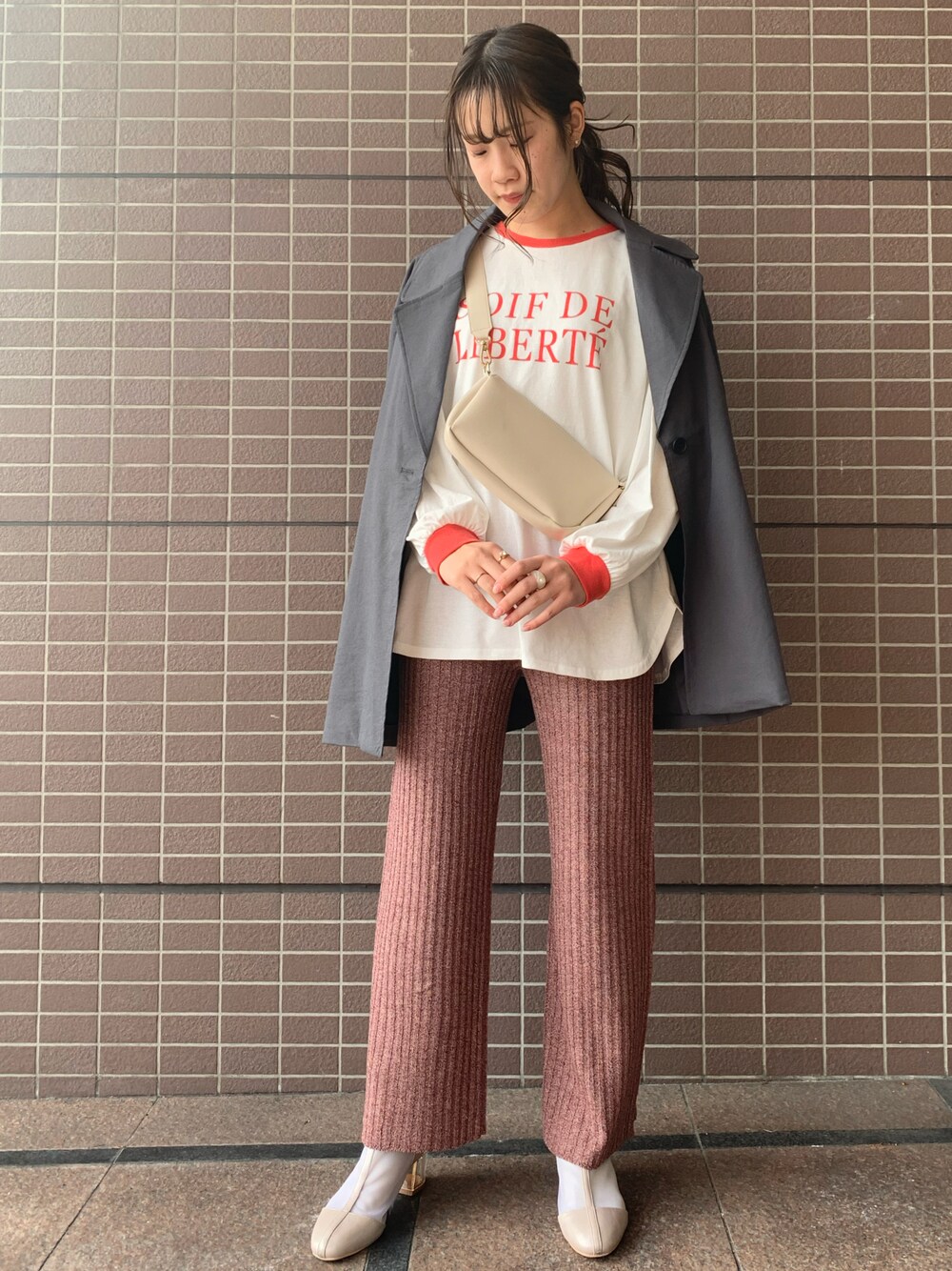 ■アウター 普段着用サイズ:Mサイズ 今回着用サイズ:Fサイズ 【着用感】 Bigなデザインのジャケットは、しっとり肌触りの良いレーヨン混で着心地抜群! シャツ合わせでオンスタイルにもオススメです。 ■トップス 普段着用サイズ:Mサイズ 今回着用サイズ:Fサイズ 【着用感】 フロントのロゴプリントがポイントのリンガーロンT。長めの着丈なので、気になる腰周りもカバーしてくれます! ■ボトムス 普段着用サイズ:Mサイズ 今回着用サイズ:Fサイズ 【着用感】 程よく肉厚でふっくらとしたリブ素材なので着心地も抜群! シンプルなデザインなので、オンオフ問わず幅広いコーディネートに大活躍。 ゆとりあるフレアな形ですが、リブによる縦線で細見せも◎