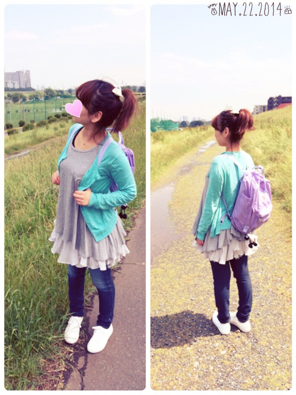 半袖だとちょっと寒い☆河原へお出かけ。 パステルカラーのカーデとパープルのカンケンがポイントでしす♫