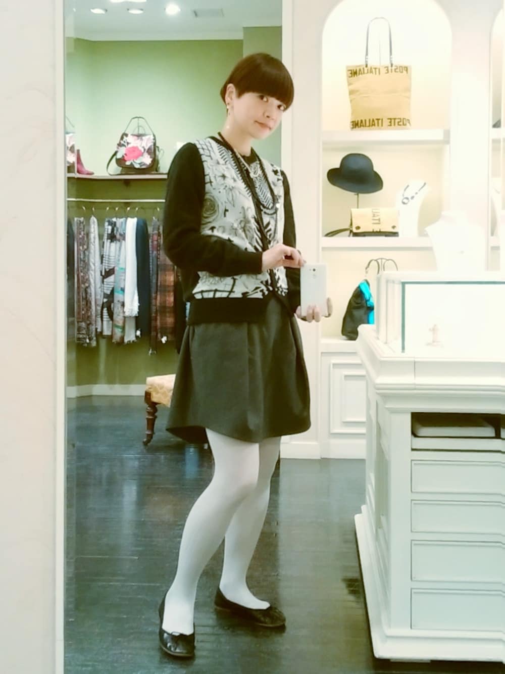 少し寒くなってきました。やっと冬。重ね着が楽しいです。 今日はキチンとした感じにコーディネートしました。 お店にはクリスマスの新作が入荷中です。