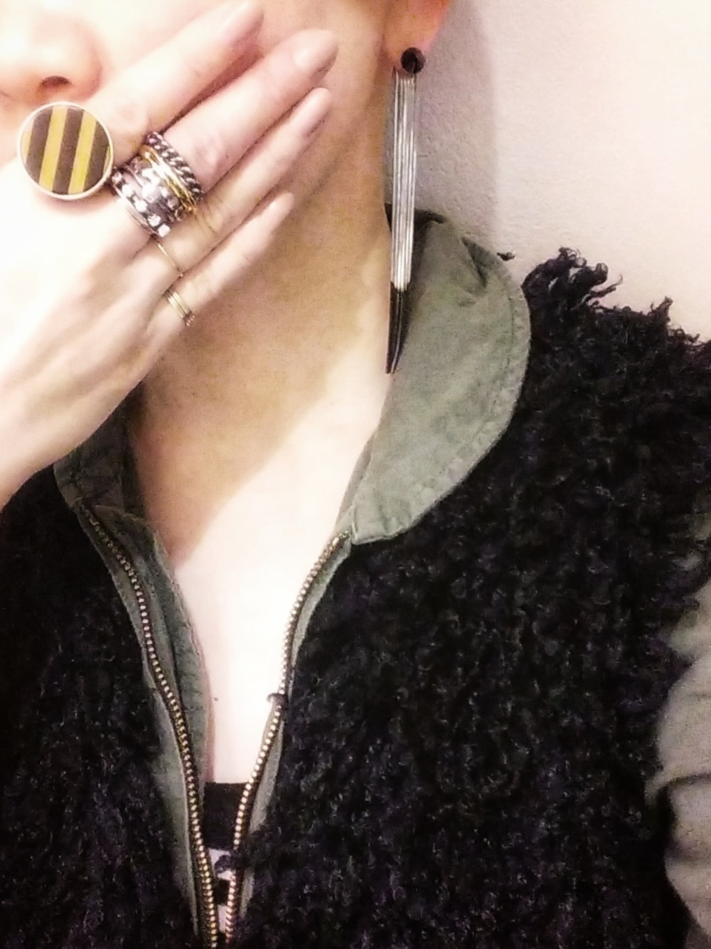 手元コーディネート。 IOSSELLIANIのスタックリングとWOUTERS&HENDRIXのしましまリングでボリューミーな重ね付け。