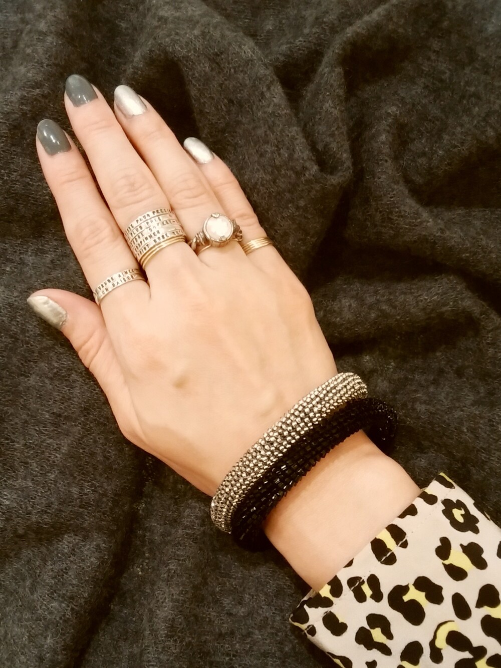 7連リングはこれだけで着けたり、何かを重ねたり。 存在感はあるけれど、他のアクセサリーを引き立たせることも出来るので出番が多くなります。 アプロージオ&コーのビーズブレスレットは、今日はブラックとシルバー。 たくさん持っている中から色違いを2本・3本重ねるのが、私の定番。