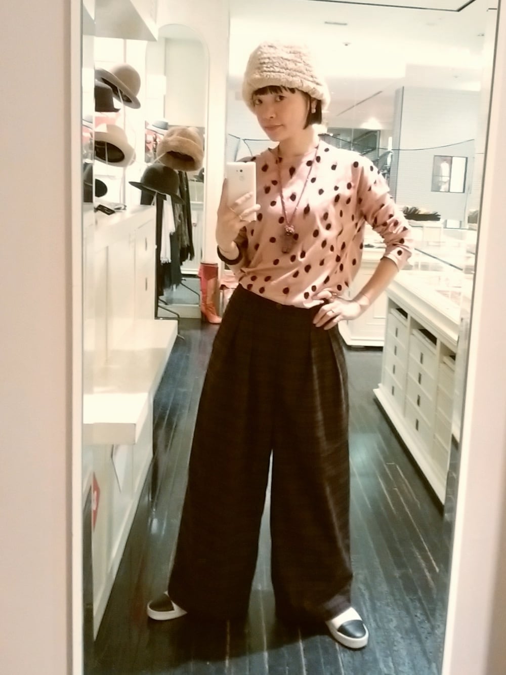 ピンクの水玉トップス+ボルドーのチェックパンツで同系色コーディネート。 ネックレスはイタリアのブランド、アプロージオ&コーのチェシャ猫。 ファニーフェイスに癒される。