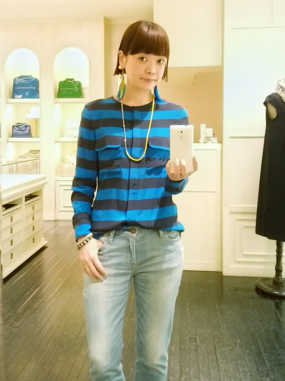 変なお天気ですね。風の日は嫌いじゃないけれど。 今日はハッピーな気分にしてくれるナッシュの鳥ピアス。 分かりやすくブルー×イエローのボーダーシャツと。 かわいいピアスがたくさん欲しい!