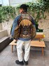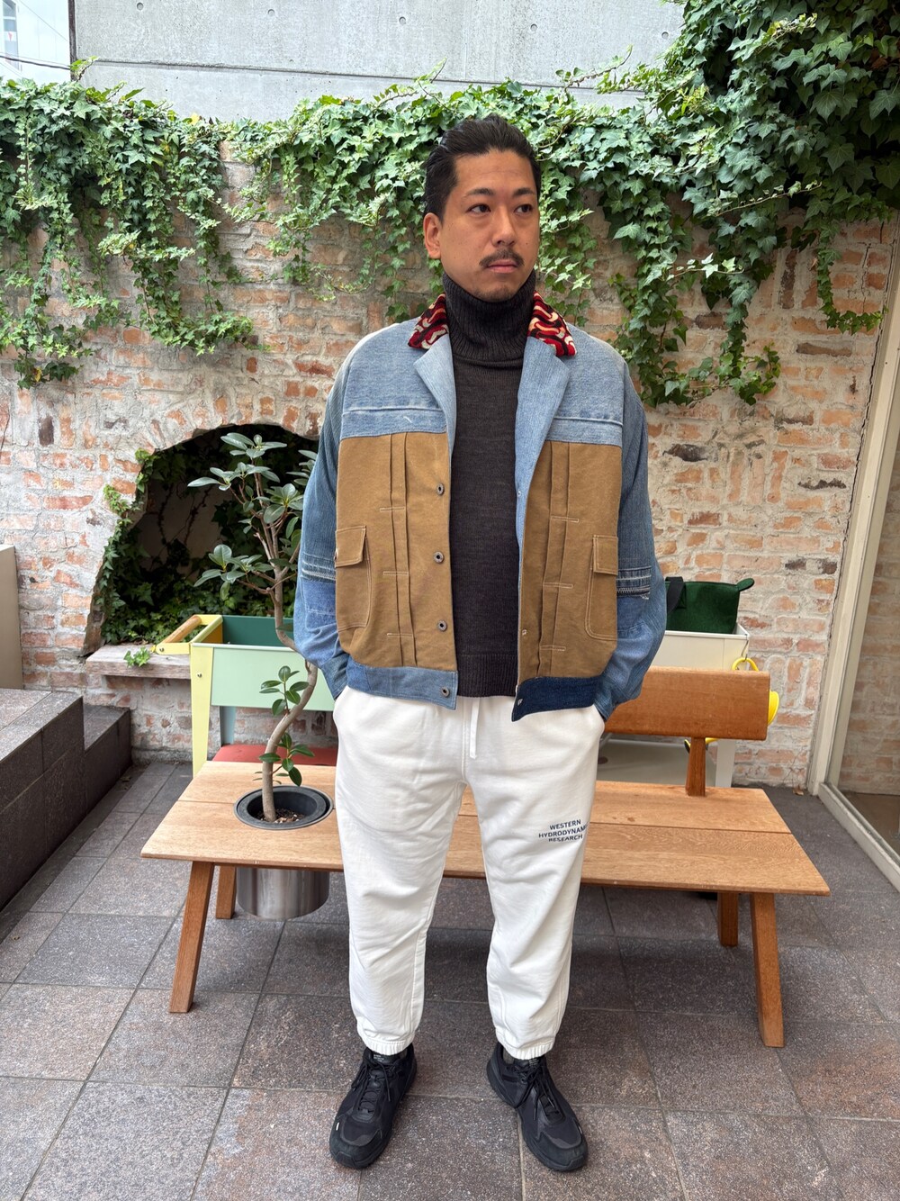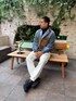 サイズはオーバーサイズながら着崩れないデニムジャケット、アクティブに動ける装いの中にもハイネックニットで大人ならしさはアピール。 パンツのロゴがワンポイントで使い勝手◎