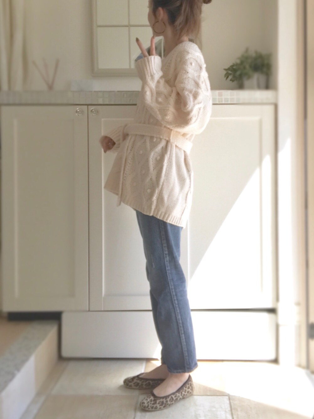 miiimのニット/セーター「<高橋愛さんコラボ>ラブ&ピースプロジェクト パプコーン編みのウエストマークケーブルニットトップス」を使ったコーディネート