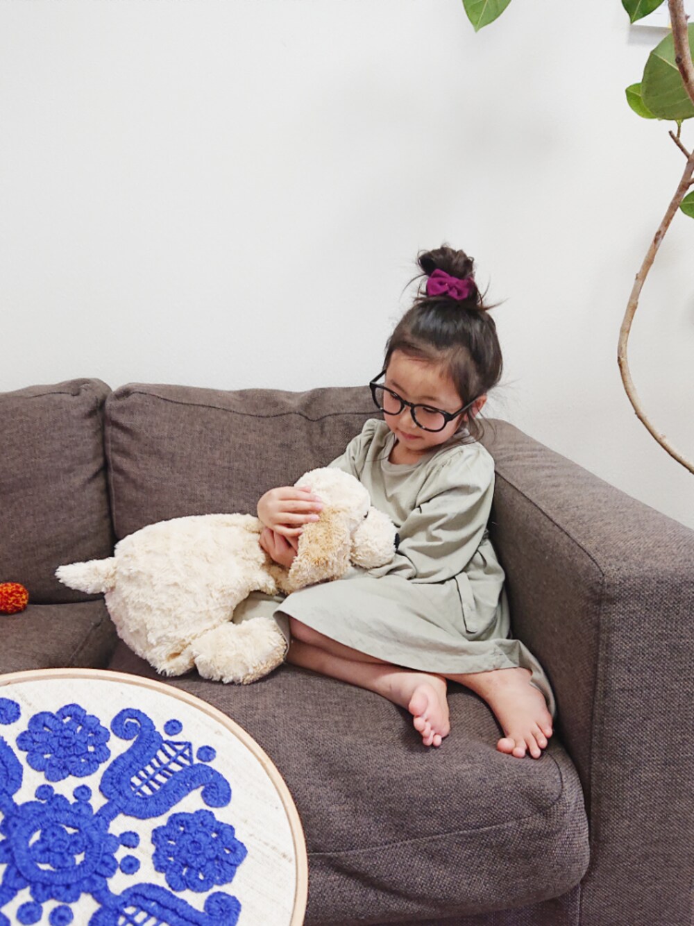 おうちコーデ おうちではさらっと1枚で着れるワンピを着ていることが多い娘です。 ご覧いただきありがとうございます☺️