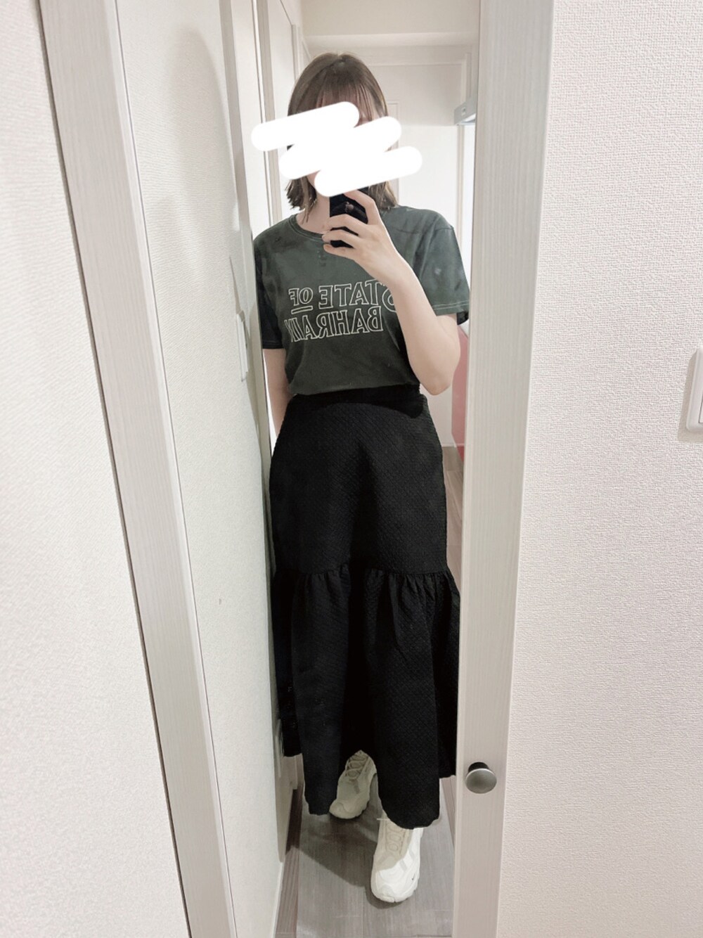 このロゴTシャツ、ステッチが良い感じで気に入って購入しました! ティアードスカートもめちゃかわいい! Tシャツインしても腰回り細見えするの最高。