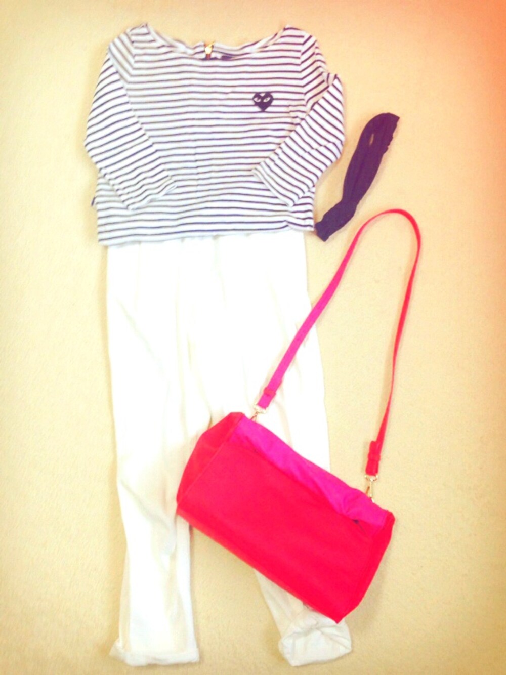 トップス:H&M パンツ:W closet バッグ:ZARA ヘアバンド:雑貨屋さん マリンコーデ♡ 白アイテムはかわいいけど、 汚れが目立つから難しい…