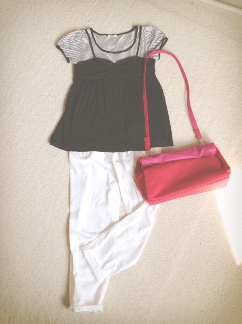 ボーダーTシャツと黒のビスチェ?はくっついてるもの。 いつもお決まりのこのバッグ。 愛用しすぎ^o^ トップス:ハニーズ パンツ:W closet バッグ:ZARA