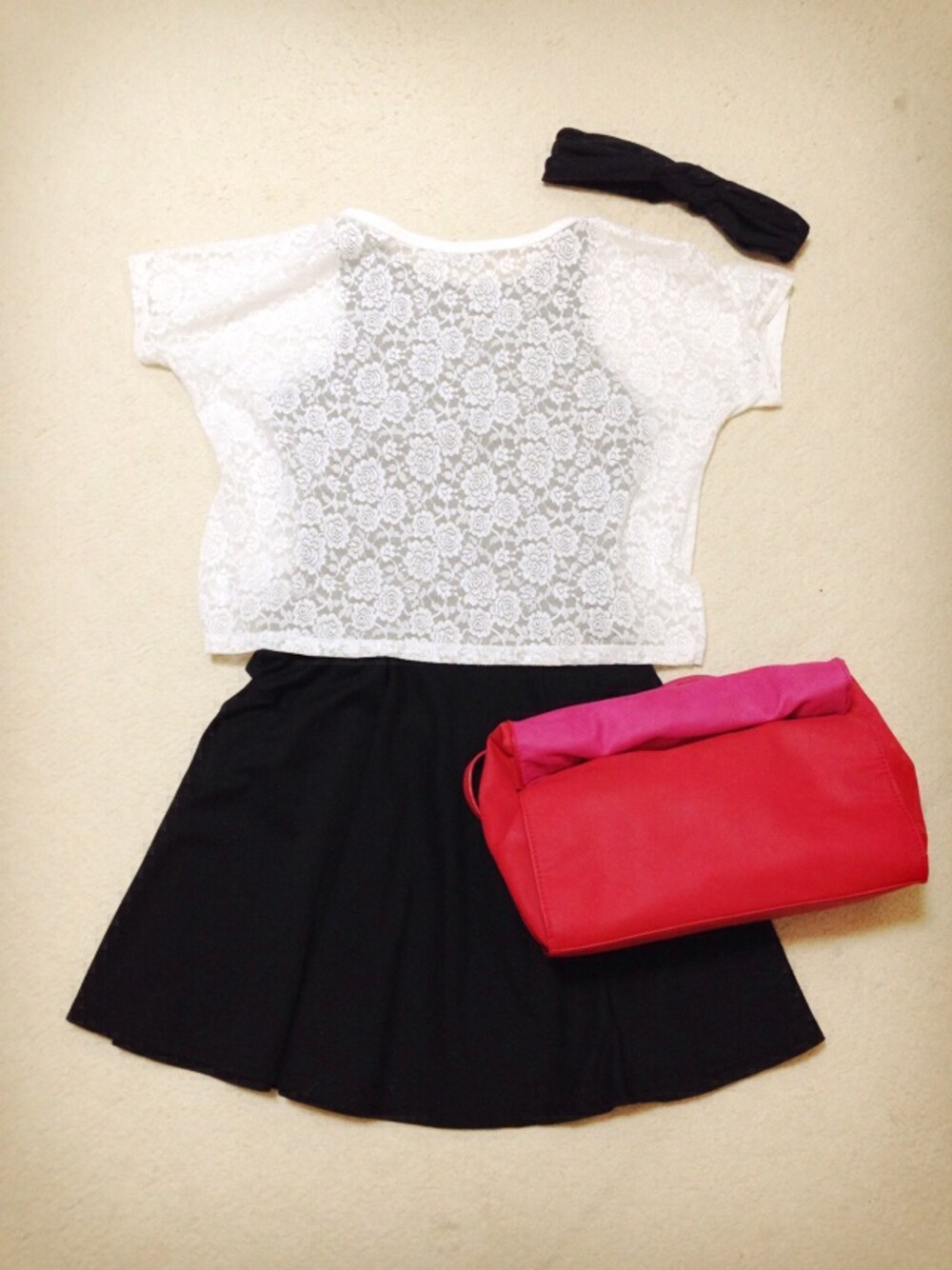 正面から見ると普通の白いTシャツだけど、 後ろから見るとレース♡ インナーとスカートはブラックで引き締め狙い🎶 そして、お決まりの差し色ZARAバックちゃん^ ^