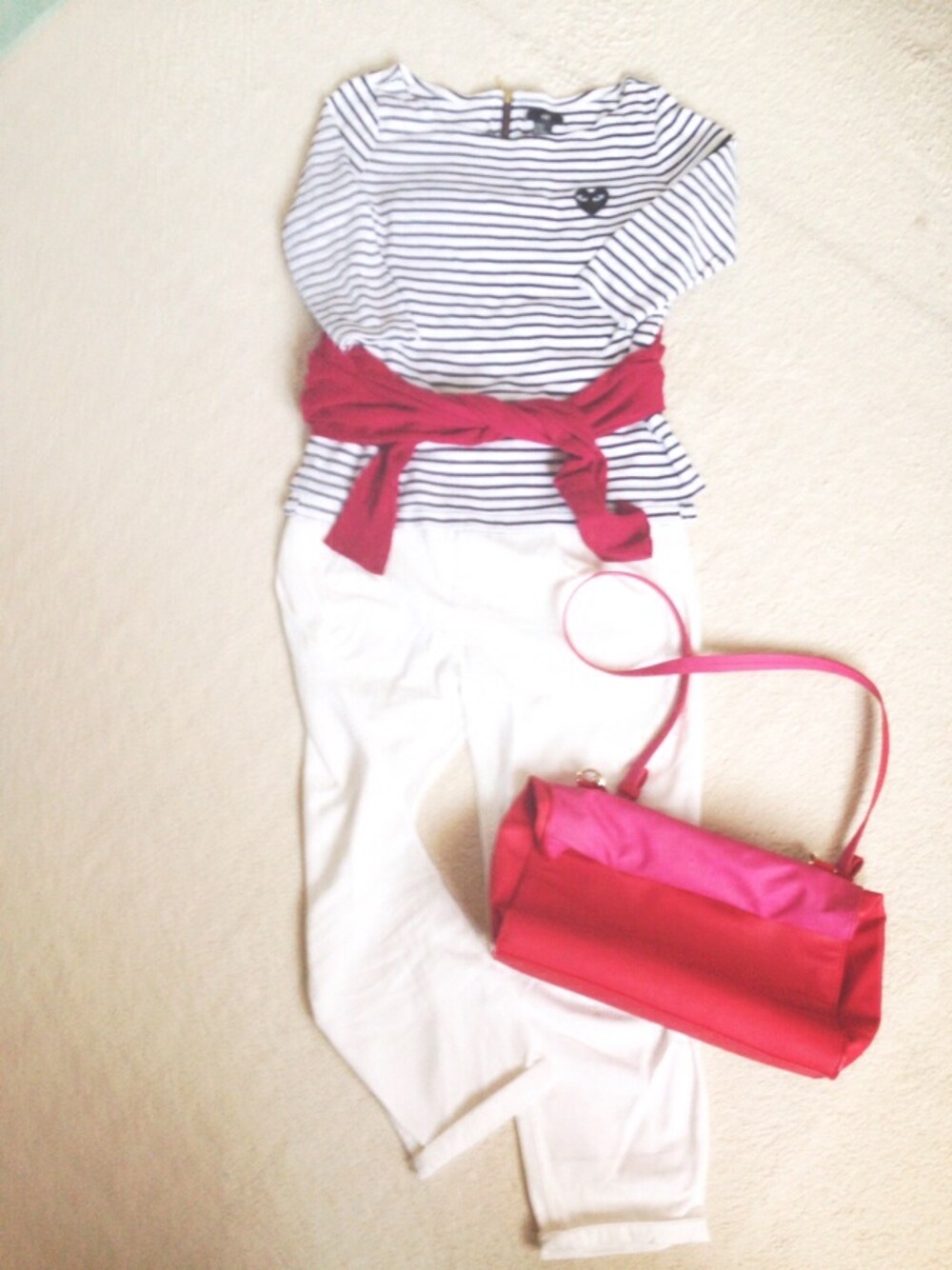 ホワイトコーデのポイントに 赤カーディガンと赤バッグ🎵