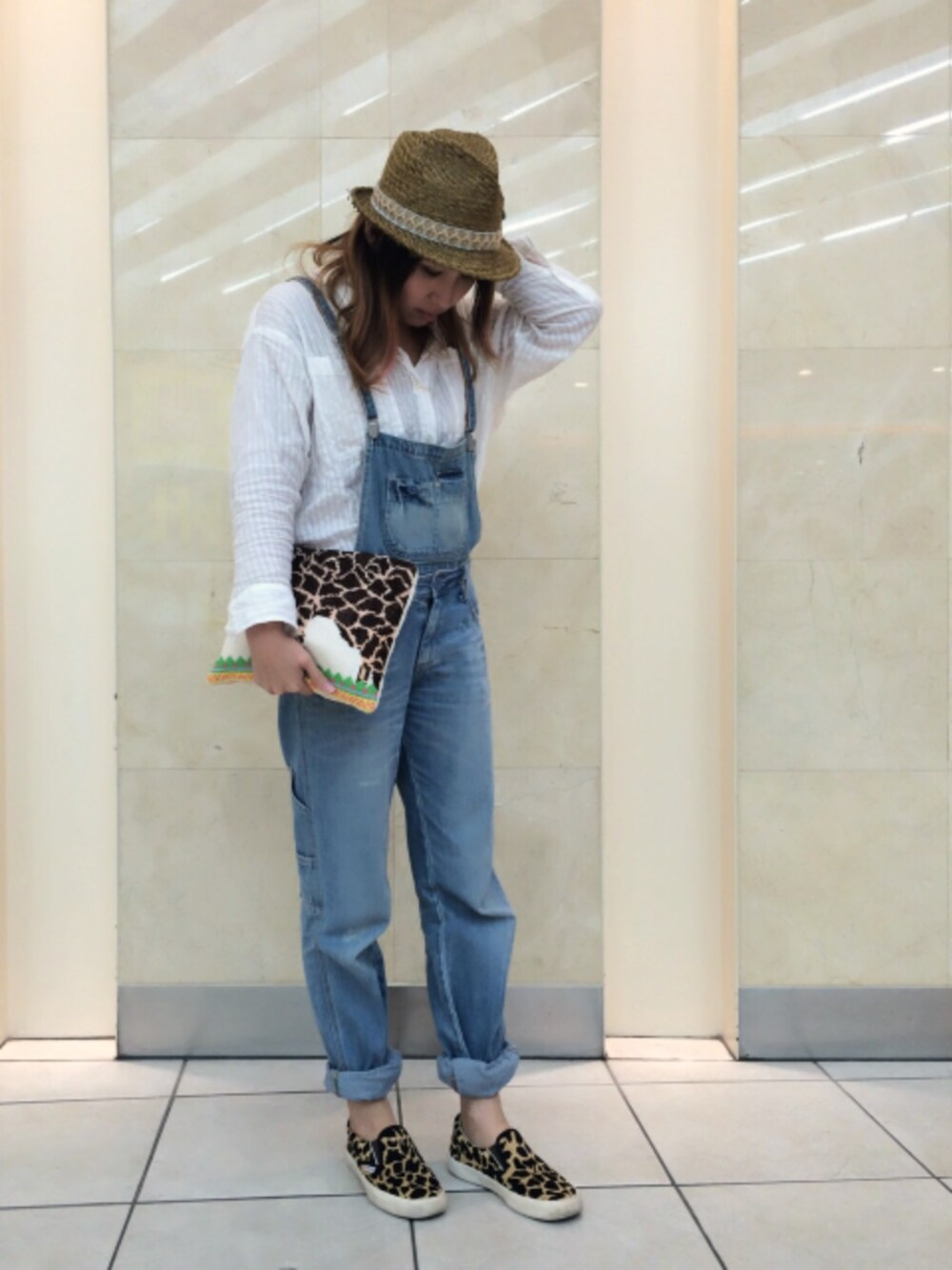 初コーデ★ 薄デニムに白シャツの定番コーデに、キリン柄クラッチとスリッポン、ストローハットでちょっとサファリ気分♩