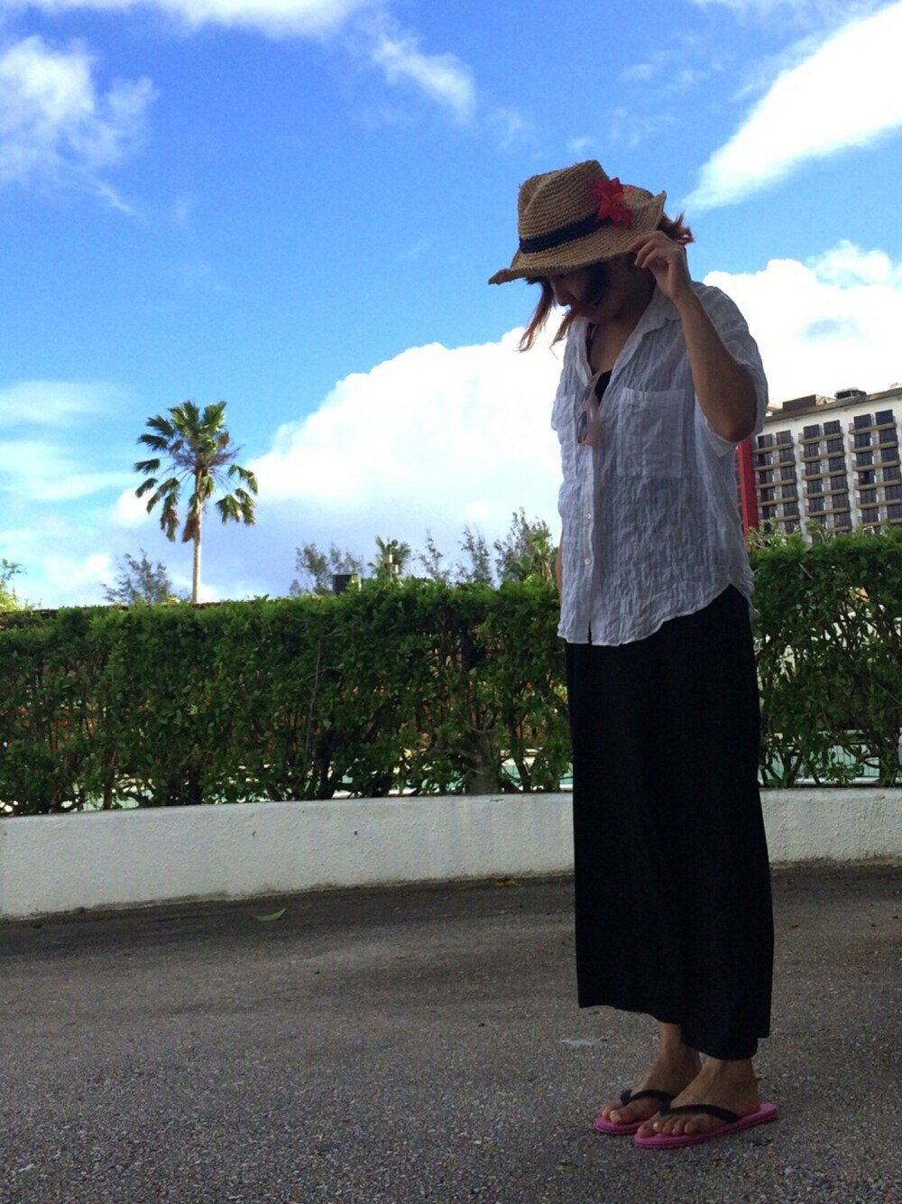 グアムにおります。 ダイビングするから着替えやすいように、ユニクロのブラトップのワンピに白シャツ。 麦わらにハイビスカスの飾り買って付けました(*^^*)