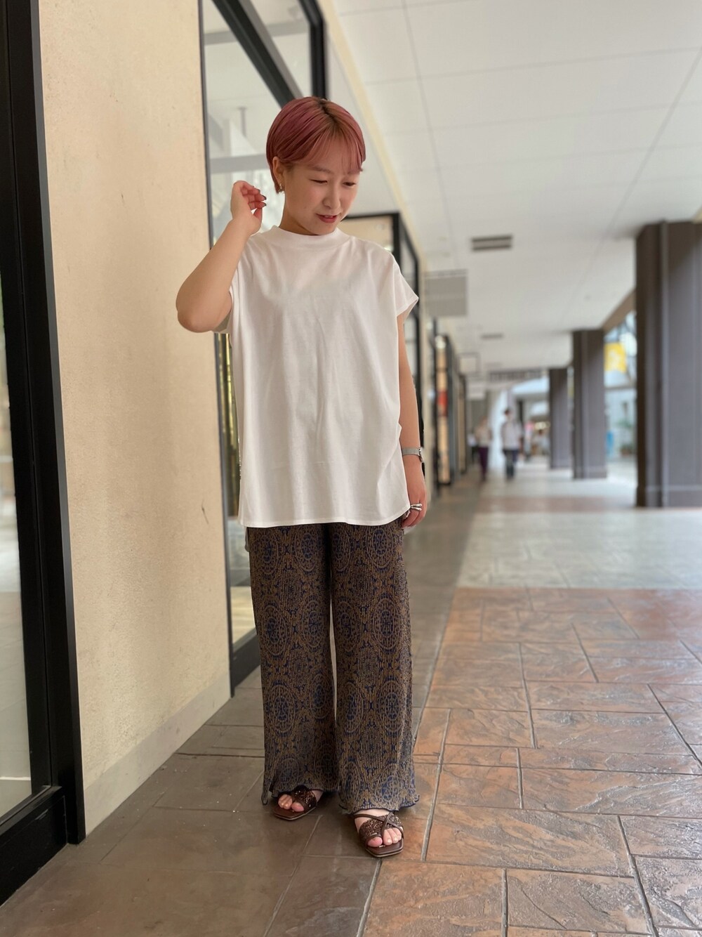 柄のプリーツパンツが映えるように白Tシャツで合わせました☁ 低身長さんでも一折りして頂ければちょうど良い丈感で履けます◎
