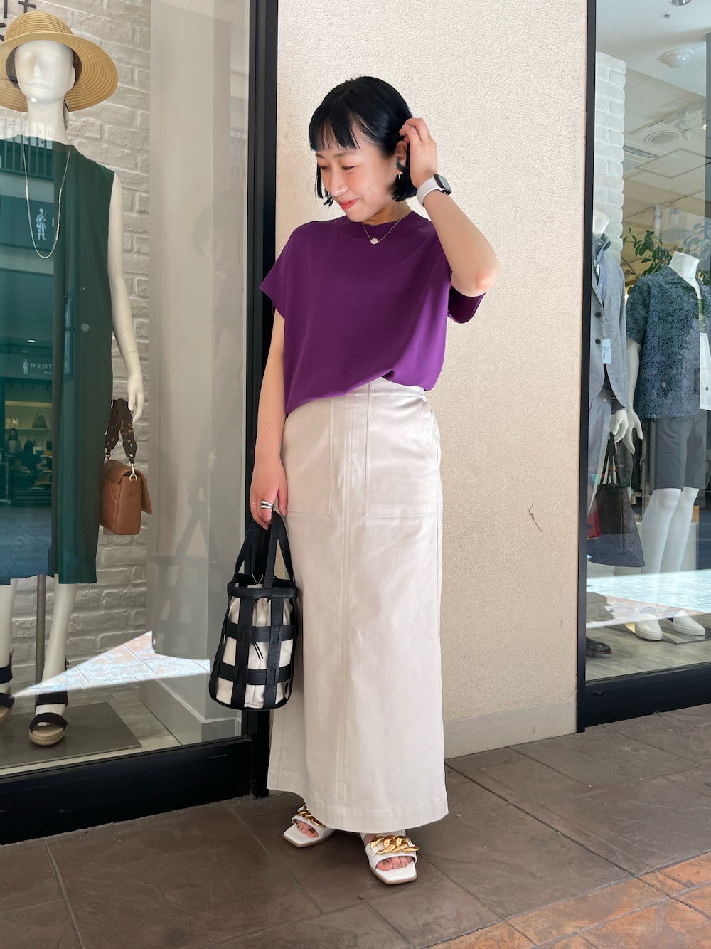 パープルもホワイトで合わせると爽やかになりますよ💜×🤍 ロングのタイトスカートが大人っぽくて可愛い✨✨