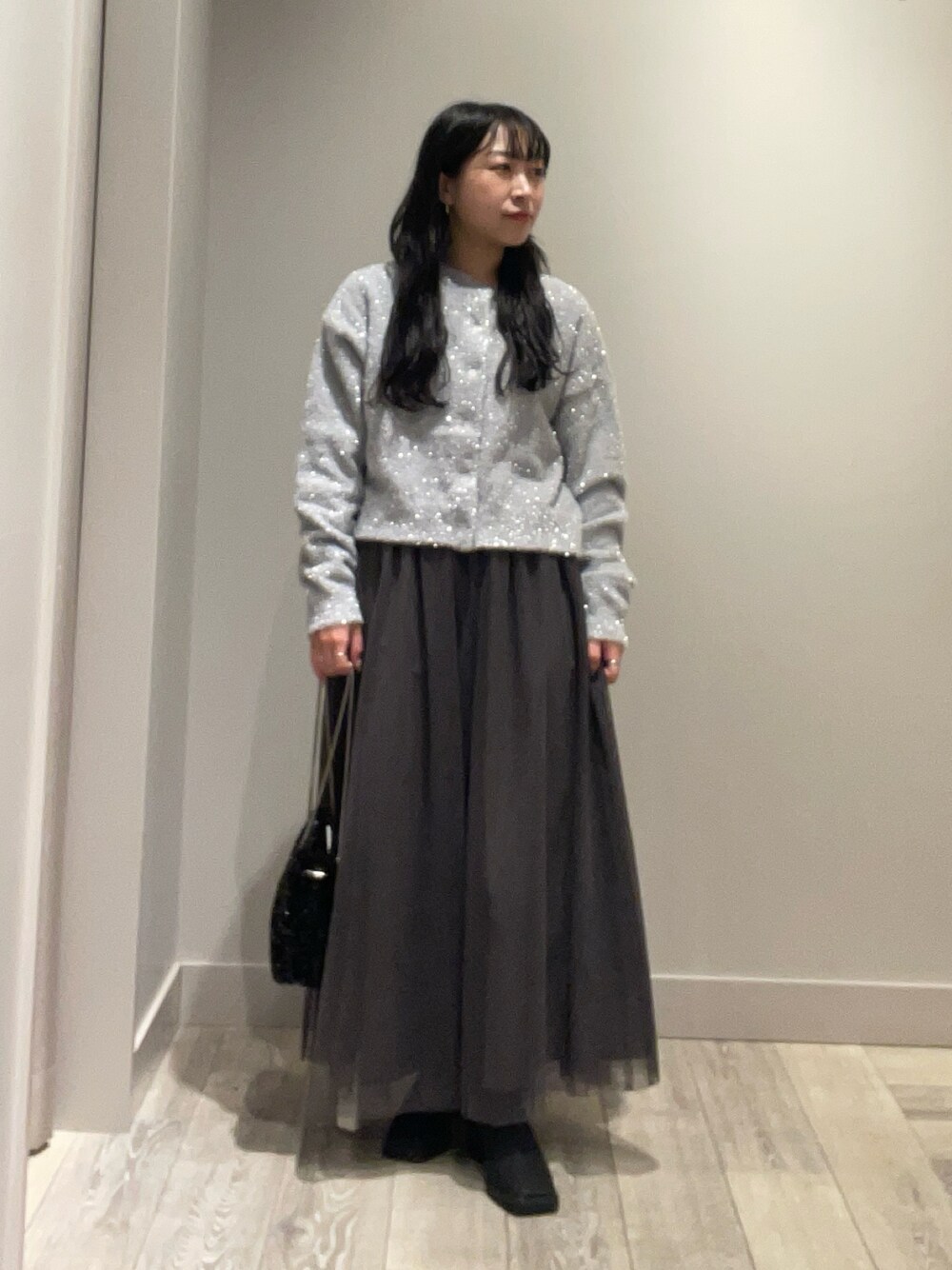クリスマスシーズンに着たいラメニット🩶🎅🏼🎄 グレーのワントーンコーデにスパンコールのバッグで華やかに✨️