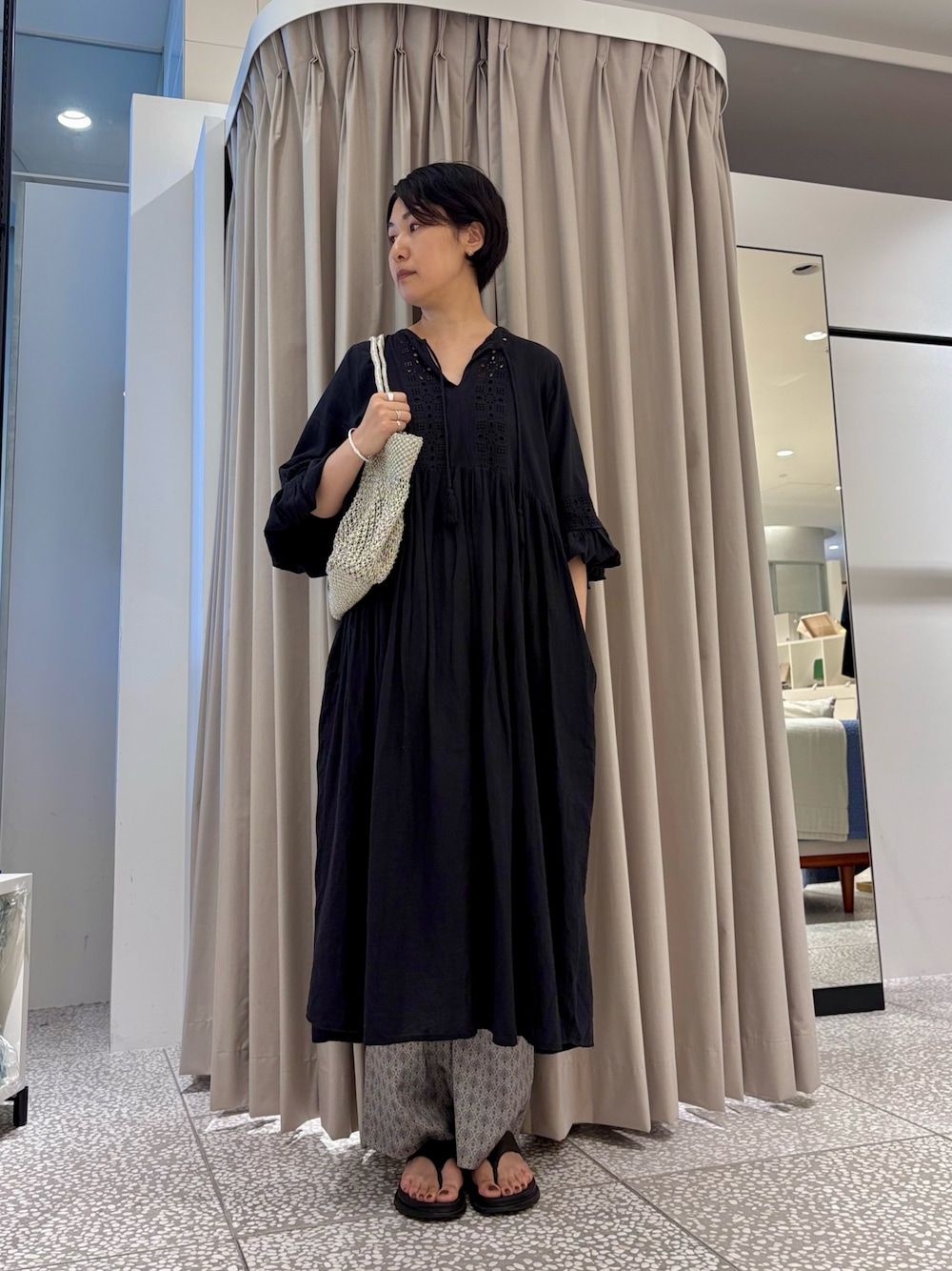 ◆身長:166cm ◆年齢:40代 ◆骨格:ウェーブ ◆パーソナルカラー:イエベ秋 ▽着用サイズ/コメント 【ワンピース】 フリーサイズ インド綿で涼しく肌触りもさらりと気持ちの良いワンピースです。袖にゴムが入っているので袖をあげてボリュームだすととてもかわいいですよ◎高身長の方でも一枚で着やすい丈感です! 【バッグ】 毎年大人気のマクラメ編みバッグです! A4サイズ対応。メタリックでお荷物をいれていただくと見た目よりも透け感は感じづらいです。