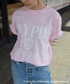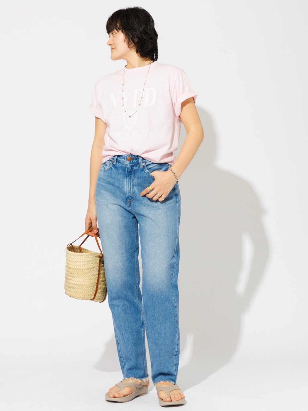 デニム×ロゴTシャツの定番カジュアルコーデ🤍 この写真ではかなり淡い色に見えていますが実際はもう少しピンクが濃いです! 女っぽ、なカジュアルスタイルが好きな方にはぜひオススメしたいピンク地にホワイトのロゴが甘めで可愛いTシャツです🌸 コーデのハズシとして活躍してくれるかごバッグは今シーズンのお気に入り✨