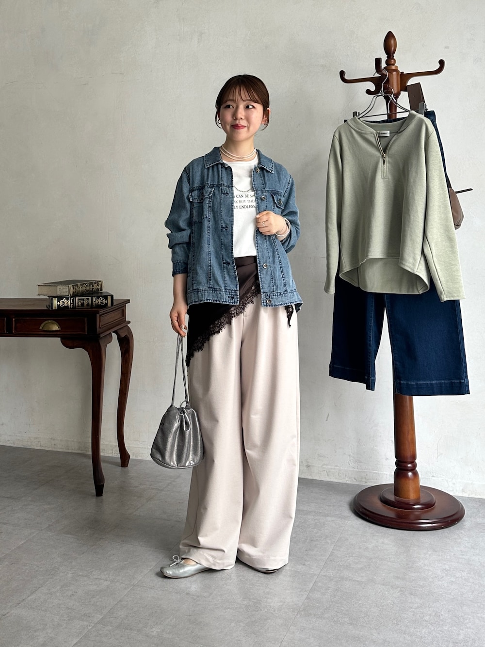 中はワントーンになり過ぎないように 差し色のスカーフを巻いたのがポイント🪽 小物はシルバーで大人っぽくまとめました。
