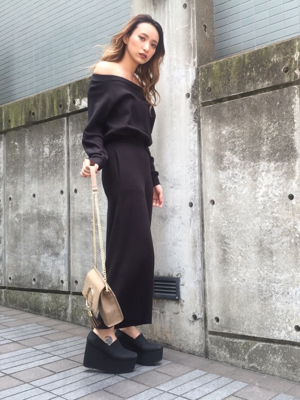 オフショルオールインワンとコンパクトなバッグで大人めに♡