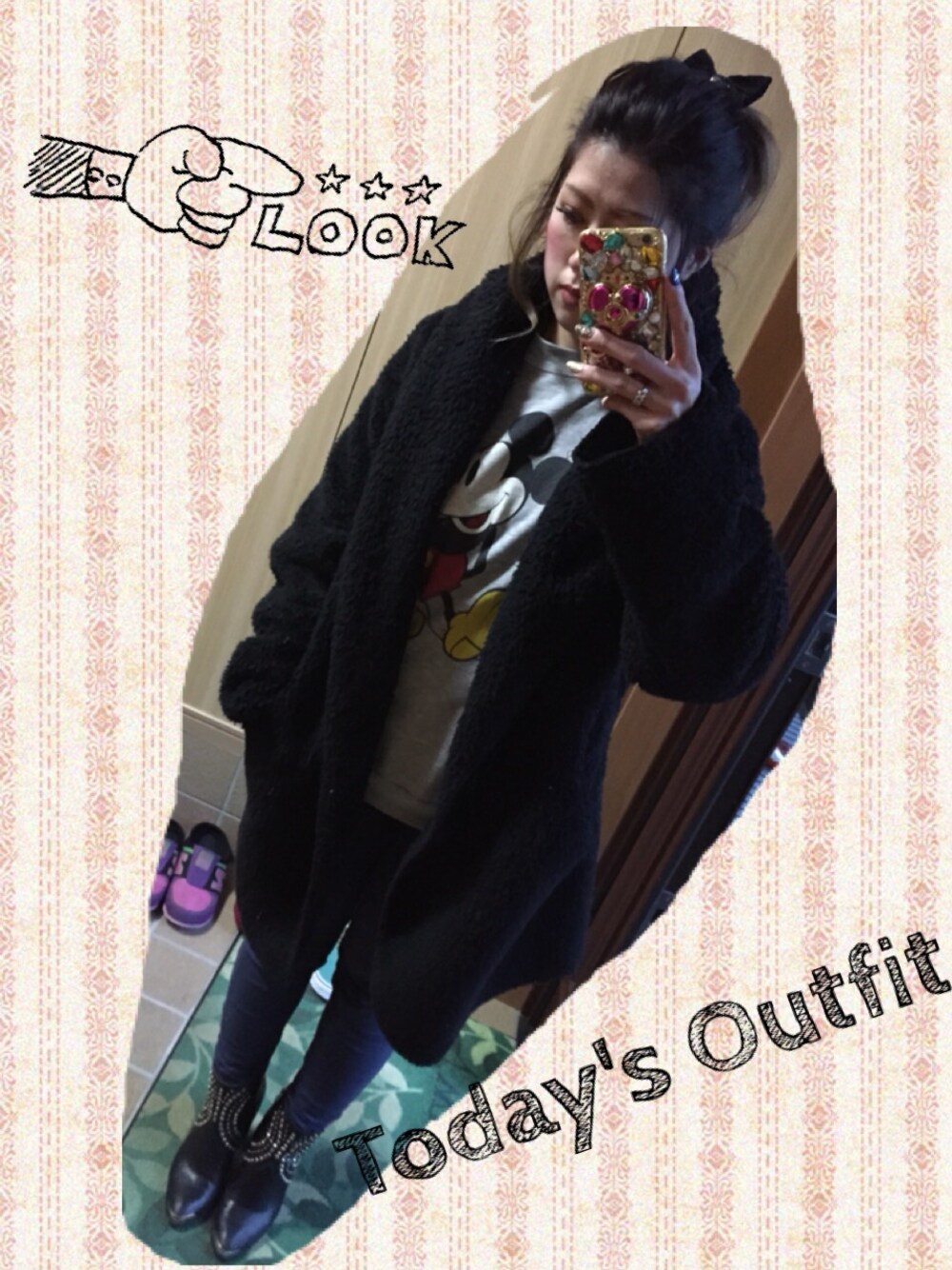 写真が暗いけど(´・ω・`) 今日もラフコーデ! スタッズ付きのブーツ、去年買ったやつやけどお気に入り♡ 結局今日もミッキー(笑) 少しサイズオーバーのスウェットは男の子っぽくなりがちやけど、 寒すぎるのでモコモコアウターとリボンで可愛らしい感じにしてみました。