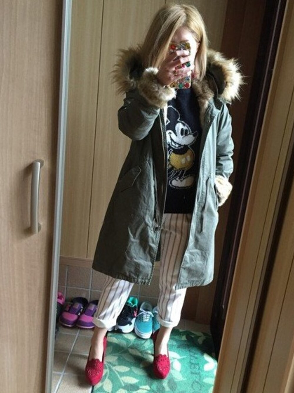 今日もまたミッキー(笑) このミッキーニット暖かくて今日みたいな日にはちょうどいい◎ 金髪にモッズコートやとかっこよくなりすぎたので今日はスニーカーじゃなくてハイヒールにしたよ! てことで今から家族でコストコ行ってきまーす