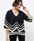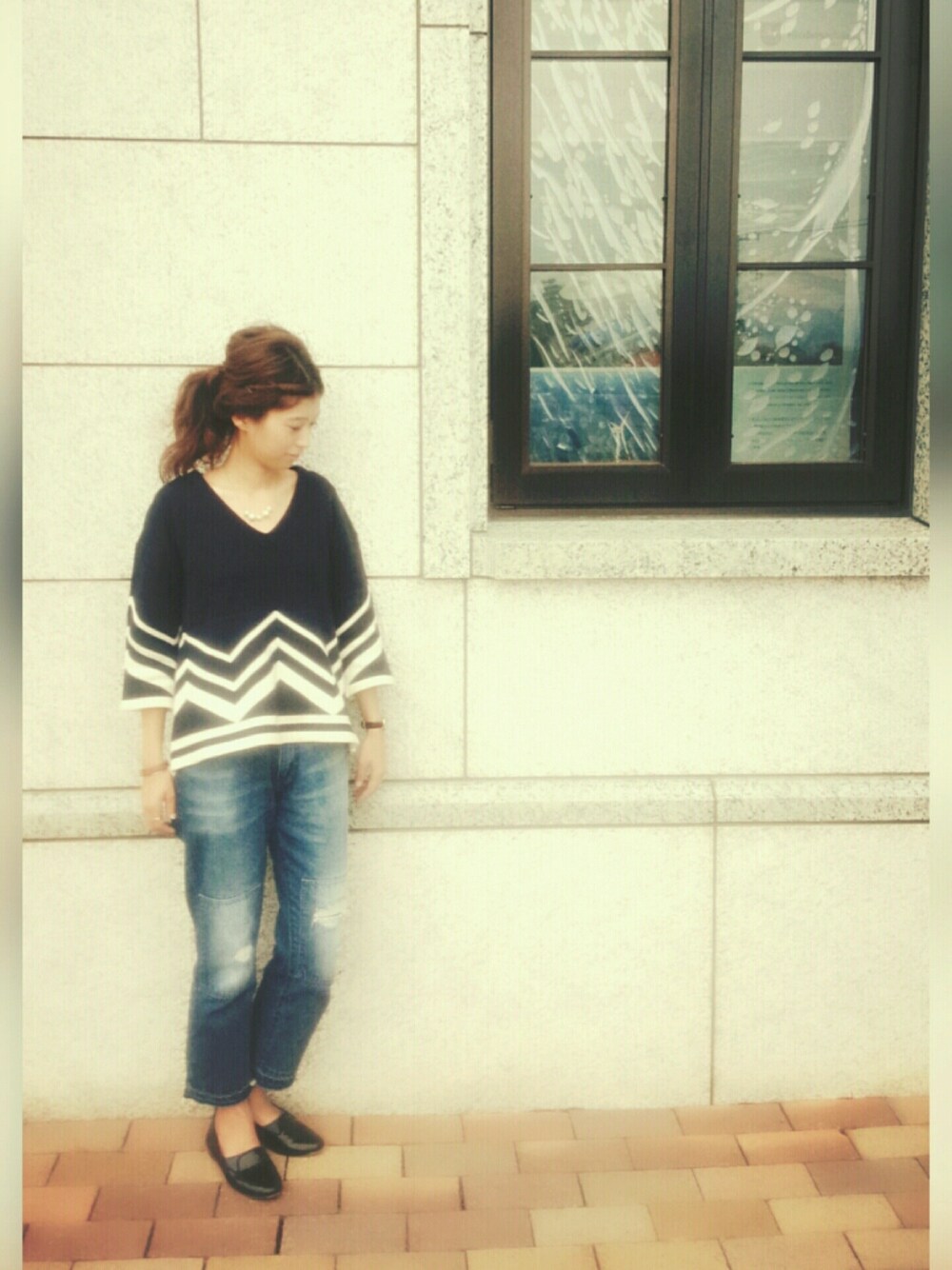 たにものニット/セーター「変化ボーダー Vネックプルオーバー」を使ったコーディネート
