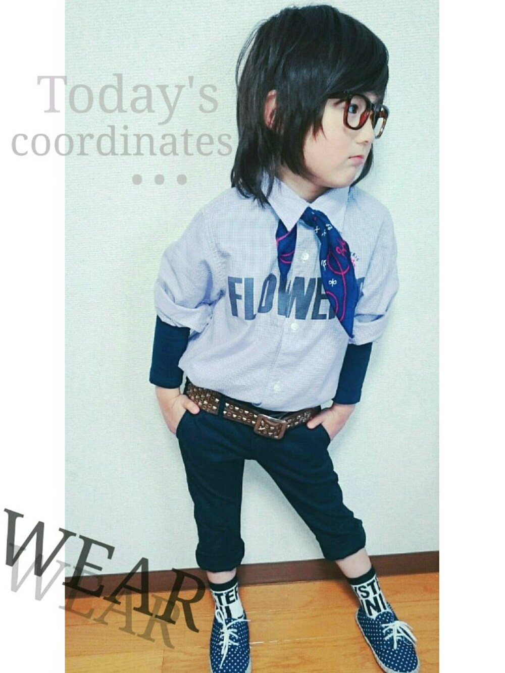 ネイビーコーデ💝 デザインが可愛くてお気に入りのシャツ✨✨ まだ少し大きいけど我慢出来ず着せちゃいましたw…可愛すぎてw😂