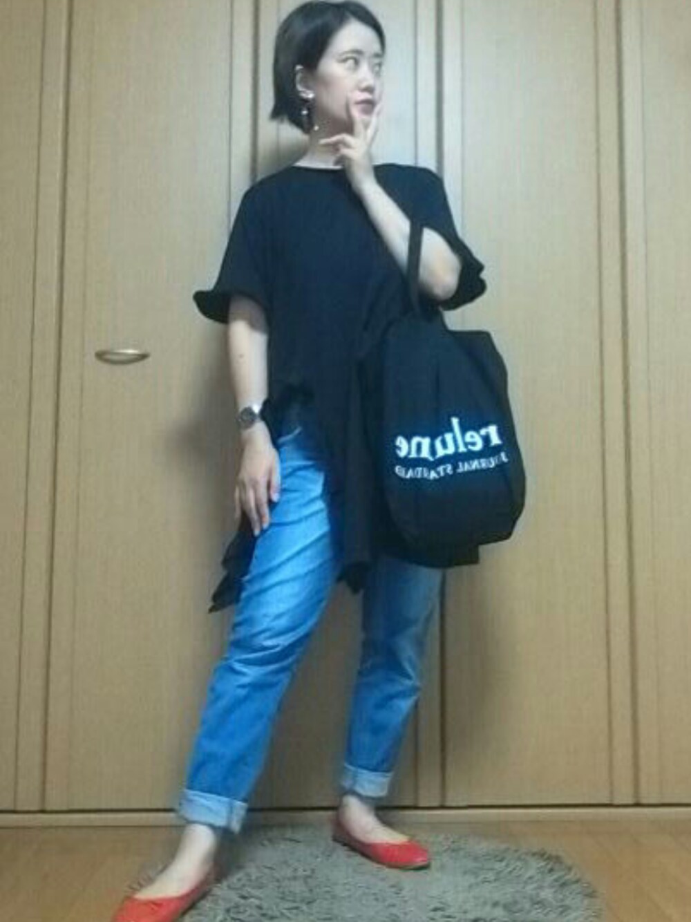 休日の楽チンお出掛けコーデ♪ LALANの黒Tワンピはフリルのスリットデザインが気に入ってヘビロテしてます。 シンプルなコーデには赤リップ♪バレエシューズの赤と揃えてます。