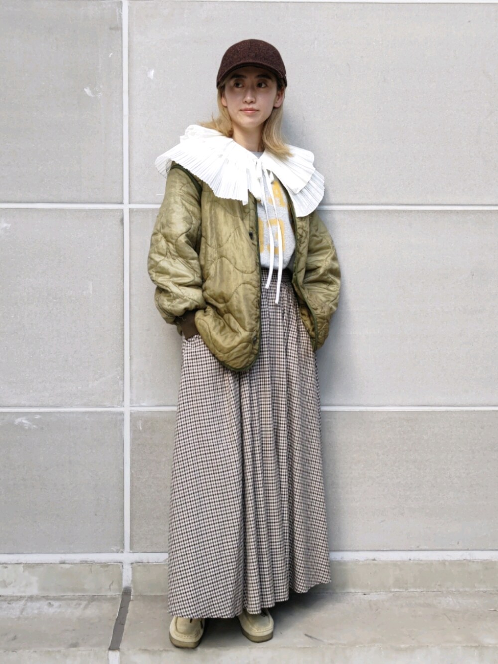 ご覧いただきありがとうございます。 キルティングライナーの上から つけ襟をプラスしたので ガーリーになりすぎないように 帽子はキャップに🧢🧢🧢 季節感のあるツイード素材のキャップは 永く使える万能アイテムです◎ Instagram or_373.m