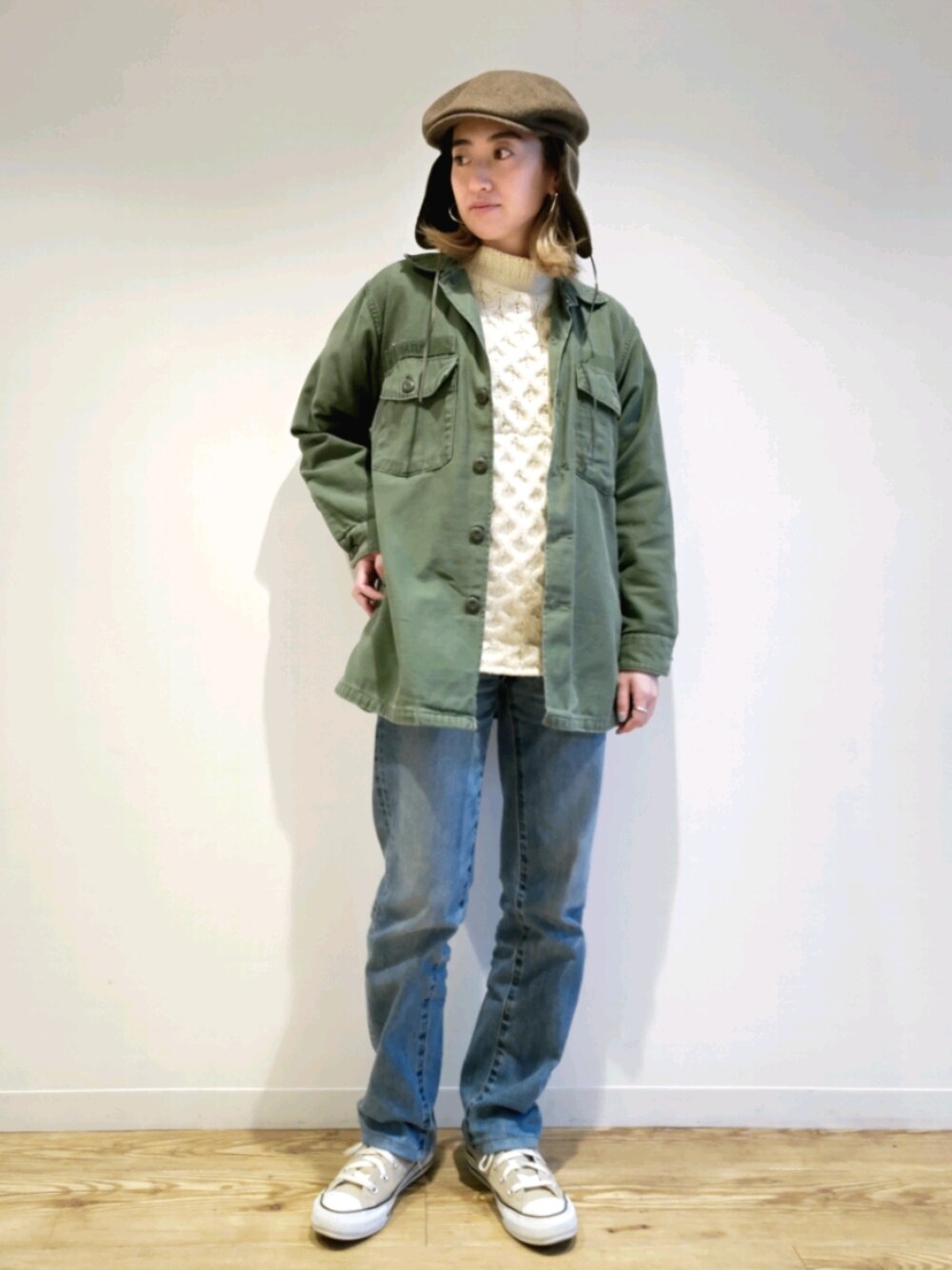 ご覧いただきありがとうございます。 今日はメンズ顔負けの アメカジスタイルで🇺🇸 白×カーキって好きなんですよね ポイントはハンチング なんと耳付き!なかなかないです! 下ろしてもあったかくて、お洒落 Instagram ▷ or_373.m