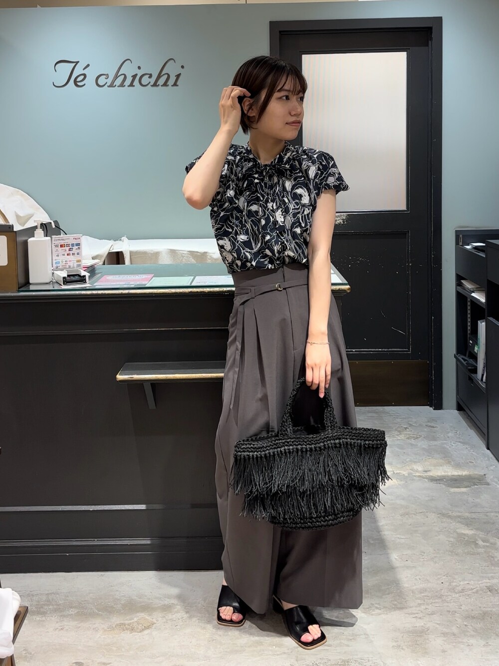 パンツはハイウエストですが後ろゴムなので苦しくならないです!🙌 ブラウスも袖がパフなので肩周りカバーしてくれます! ボウタイがついているので女性らしさも演出できます🤍