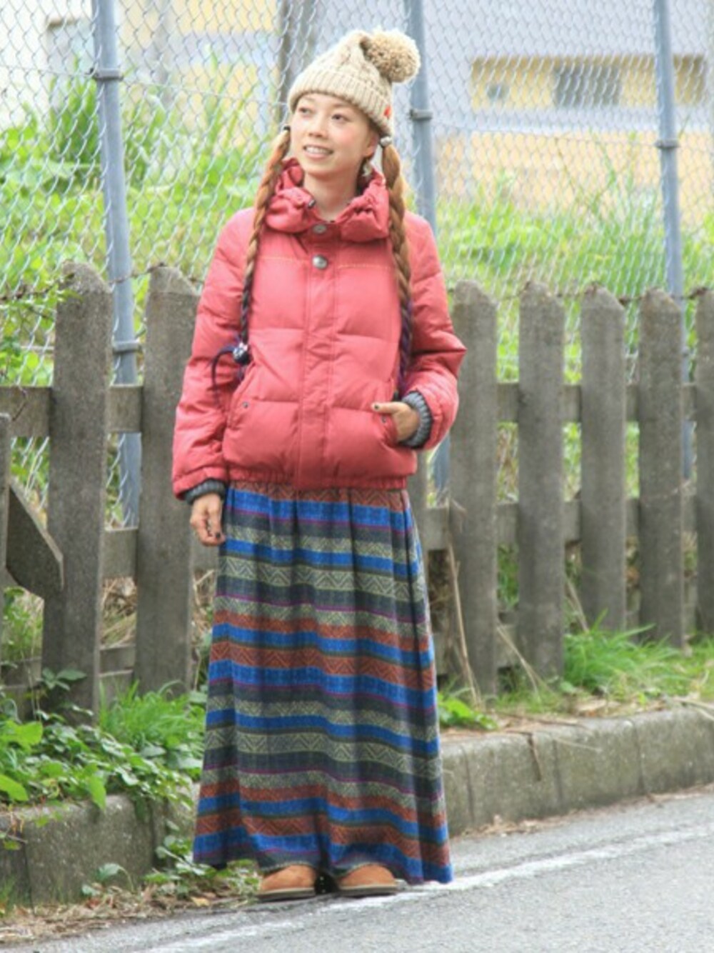 フレアなロングスカートにピンクのダウンコート。 どこから見てもインパクト抜群でキュートな雰囲気を感じるコーディネート☆ おさげにニット帽の組み合わせは女の子らしく可愛さもアップ!