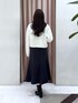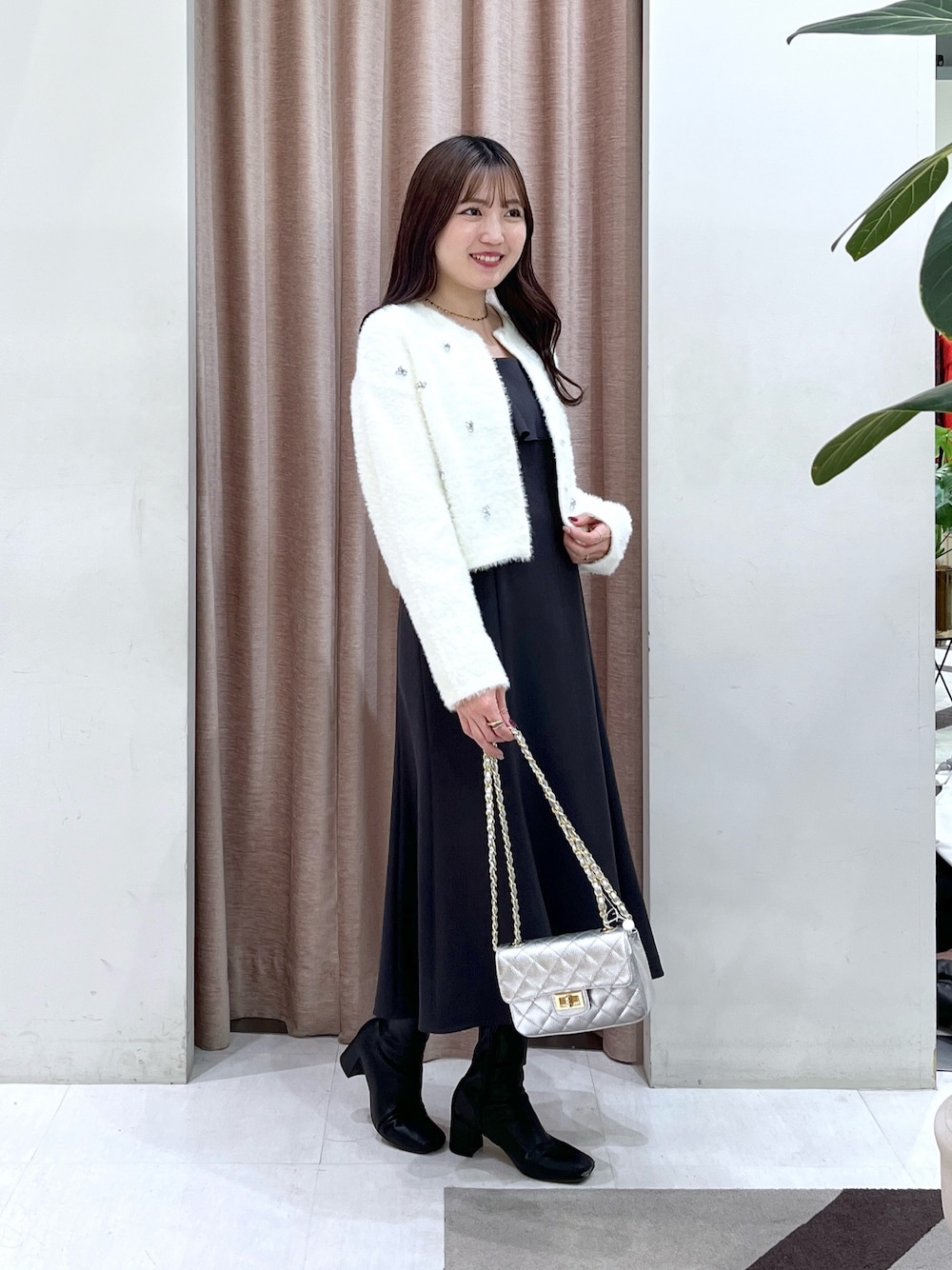 【ニット】 ふわふわの着心地が気持ちいいシャギーニット。 ビジューとパールがとても華やかで可愛い! カーディガンの羽織としても、一枚着としても着回し力◎ 【ワンピース】 マーメイドのラインがとても綺麗なキャミワンピースは 落ち感のある生地で広がりすぎずスタイルアップが叶います! 胸元のラッフルもポイントです♡ 肩紐は長さを調節できるので身長に合わせてお召しいただけます。 【着用サイズ】 ニット:F ワンピース:38