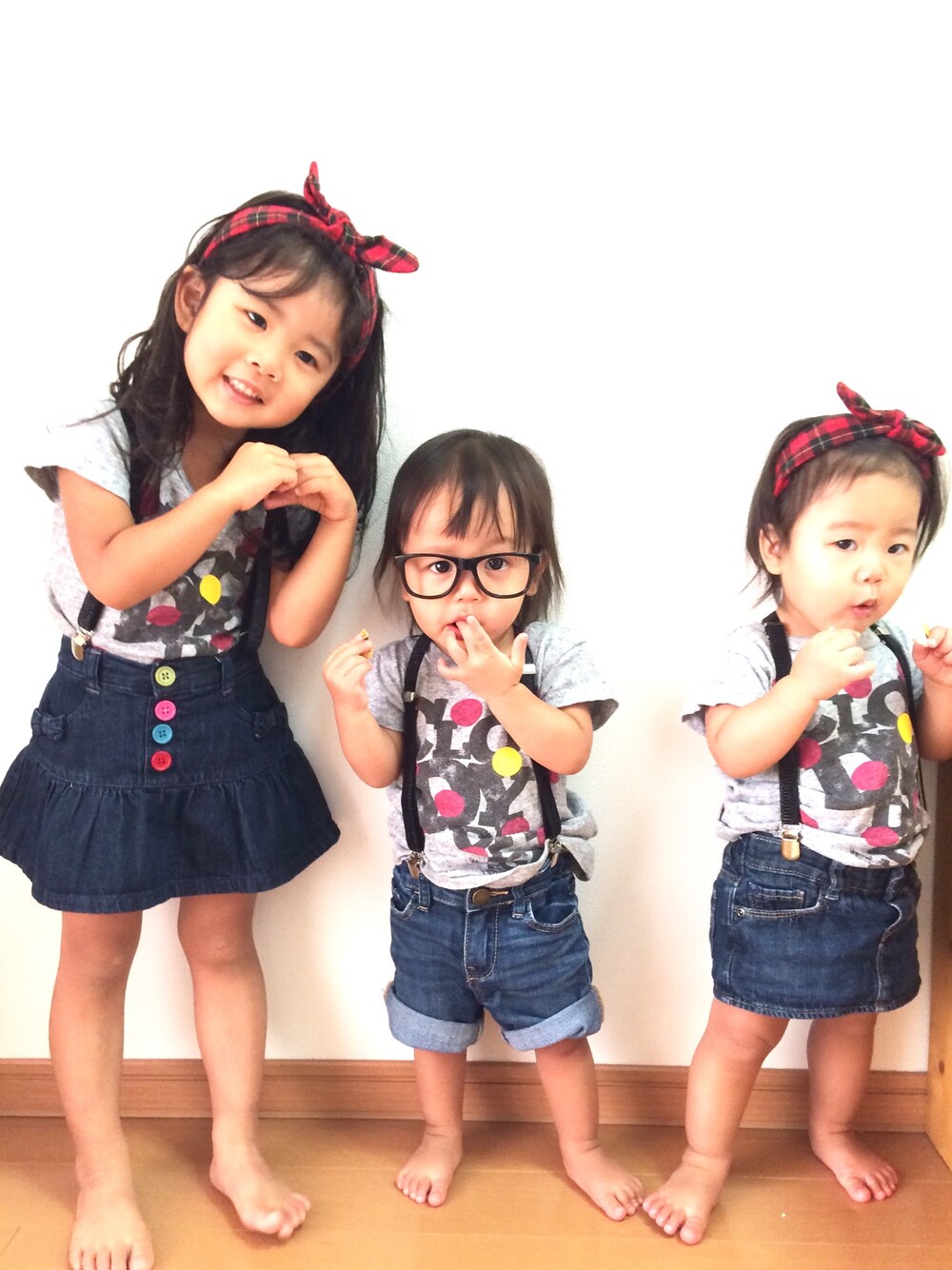 3人お揃い♡ お姉ちゃん好みが出てきてリボン・フリフリ・ピンク!みたいな女の子らしい服しか着てくれなくなってきた(>_<) 今回はデニムスカートのポケットにリボンがついてるから女の子だよ!と説得しなんとか着てくれました。ほんとはもっとシンプルなデニムスカートがよかった・・・