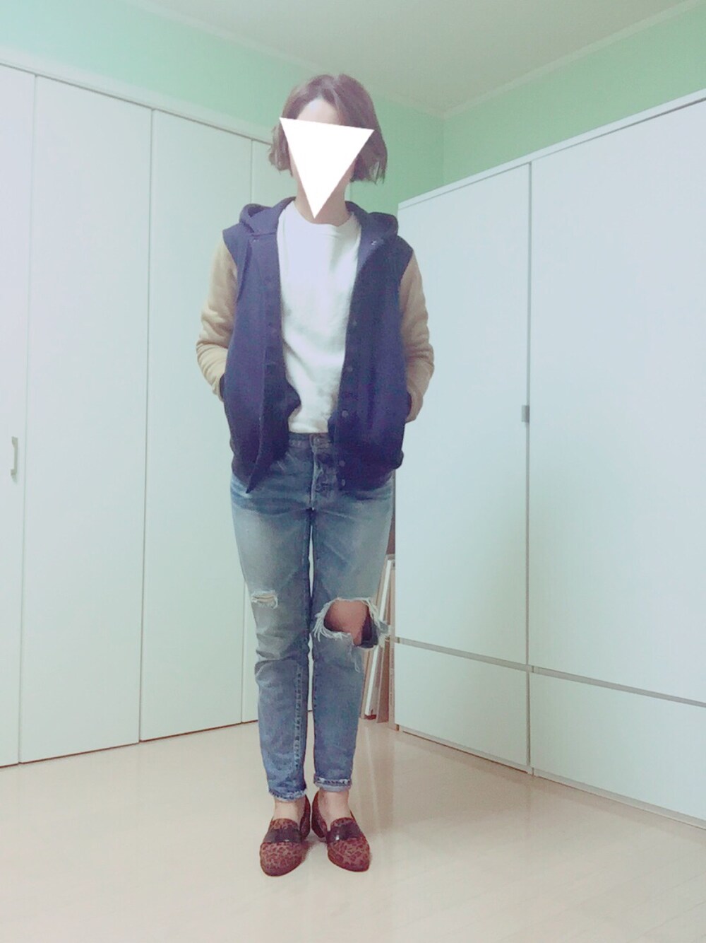今日は男っぽすぎるので足元はレオパードのローファー。見えないけどチークも濃いめにしてバランスとりました! GUのスタジャンはメンズです。ネイビー×ブラウンがお気に入り♡ メンズライクなコーデに一点レディな感じが大好き。