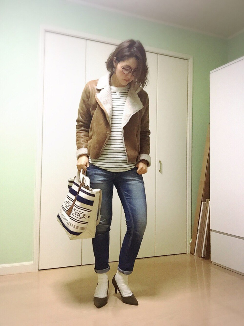 今日は暖かかったからいつもよりは薄着で。 GUのトップス着心地いいー! ボーダー×デニムとゆうラフな感じなのでこれにスニーカーだと主婦感満載になってしまいそうだったので久々のヒール👠カーキのスエードでとっても可愛くてお気に入り♡