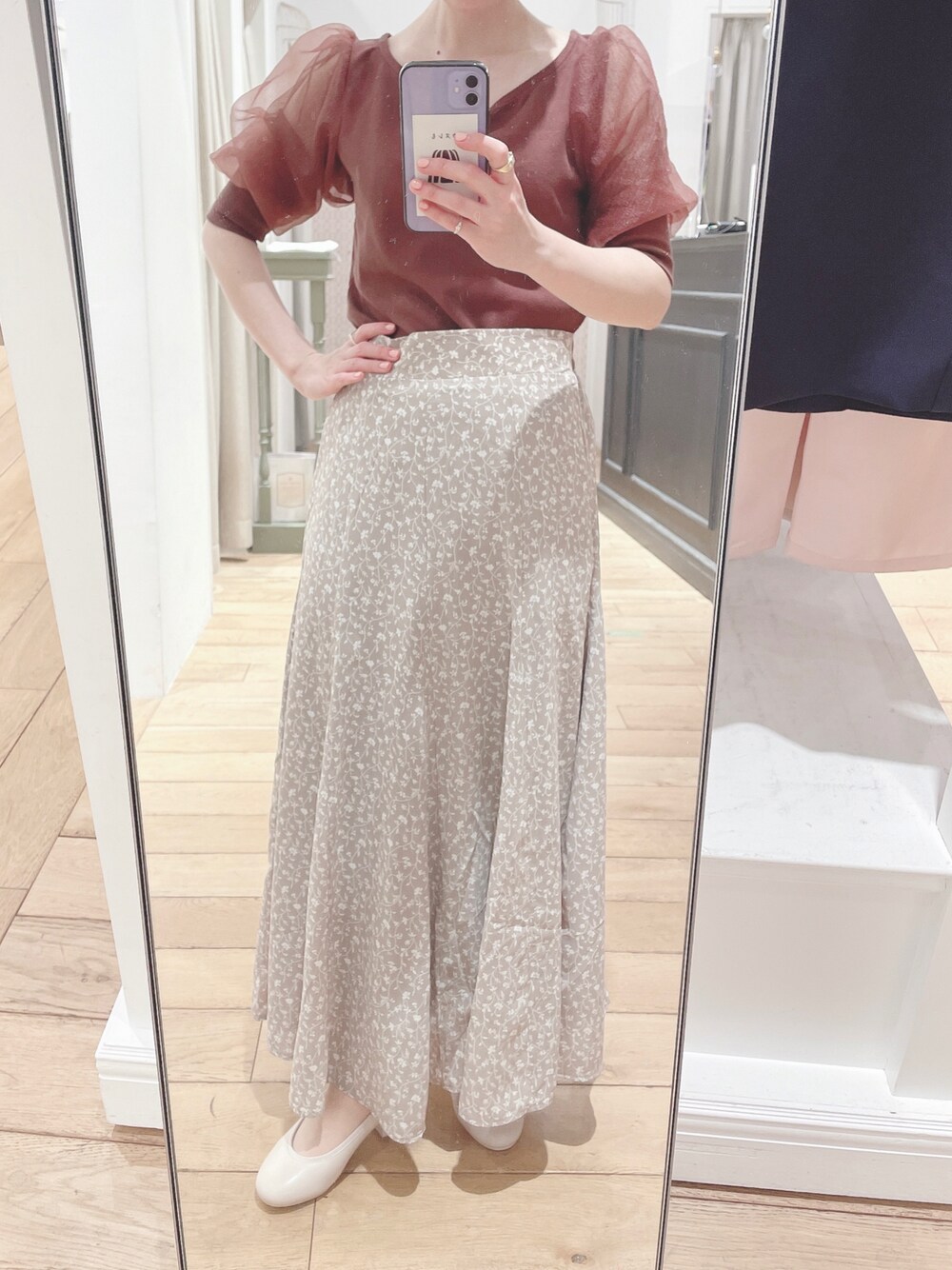 オーガンジー素材の腕部分を強調したポーズです🤩笑