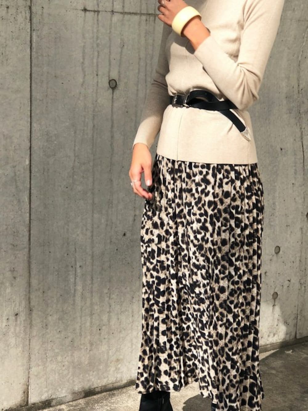 アニマル旋風♡ 定番のレオパードです! プリーツと柔らかい素材が強くなりすぎなくて、ちょうどいい。 インパクトのある柄こそ、トップスはシンプルに♡ ベルトはウエスタンテイスト⭐︎
