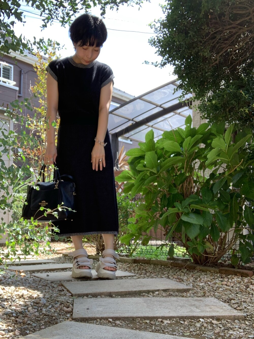 ワンピースと鞄は黒でサンダルをベージュに🍞 ワンピースウエストのところがキュってなってて可愛いんだけど伝わらない😂