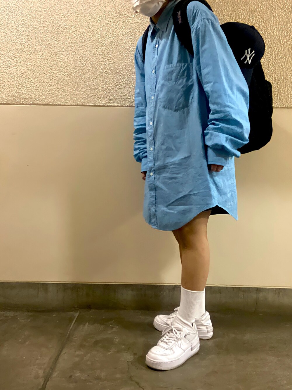 ブルー系のシャツ/ブラウスを着用したレディースの春コーディネートの1枚目の写真