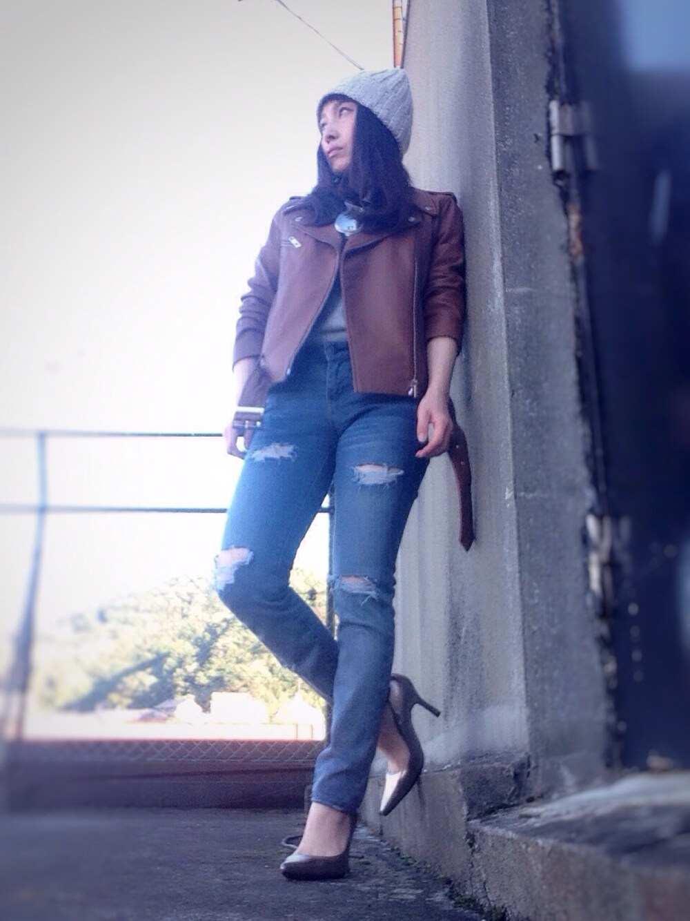 #Yフェス4に参加させていただきまーす(๑•̀ㅂ•́)و✧ ユッチさんよろしくお願いしまーす♪ Ungridのキャメルのライダースと ESPERANZAのブロンズブラウンのパンプスで参加♪ UNIQLOのストレッチスキニーを セルフでニークラッシュ加工してみましたよー♪(๑•̀∀- )و ストレッチの糸は加工難しい💦 脚が短いから市販のニークラッシュ加工デニムは履くと膝下にクラッシュが来ちゃうんですよねー( ¯ ¨̯ ¯̥̥ ) チビッコあるある…泣 ご覧いただきありがとうございますଘ(੭ˊ꒳ˋ)੭✧