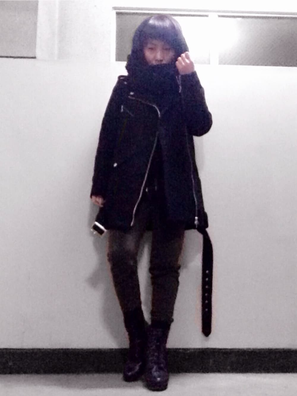 暗黒フェス2nd ラストコーデはナノユニバースの ライダースコートで 中にはGUのハイネックニットと スウェットパンツ、レースアップブーツ GU尽くし😆✨ 黒スヌードで首元にボリューム出して 髪をボブっぽく見せてますよー❤️ さて用事も済んだので 皆様の暗黒コーデと タイムラインのチェックに参ります👍🏻✨