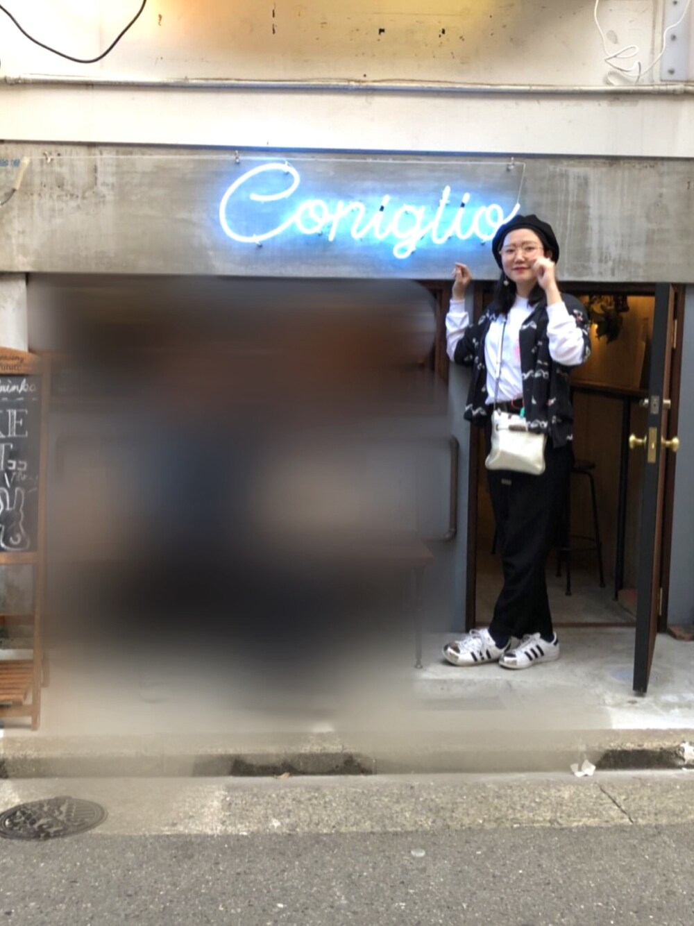 大好きなX-GIRLとAymmyのTシャツで モノクロコーデ adidasのシルバーメダルとCOACHのシルバーで統一 丸メガネかけてオシャレ気取ってます笑