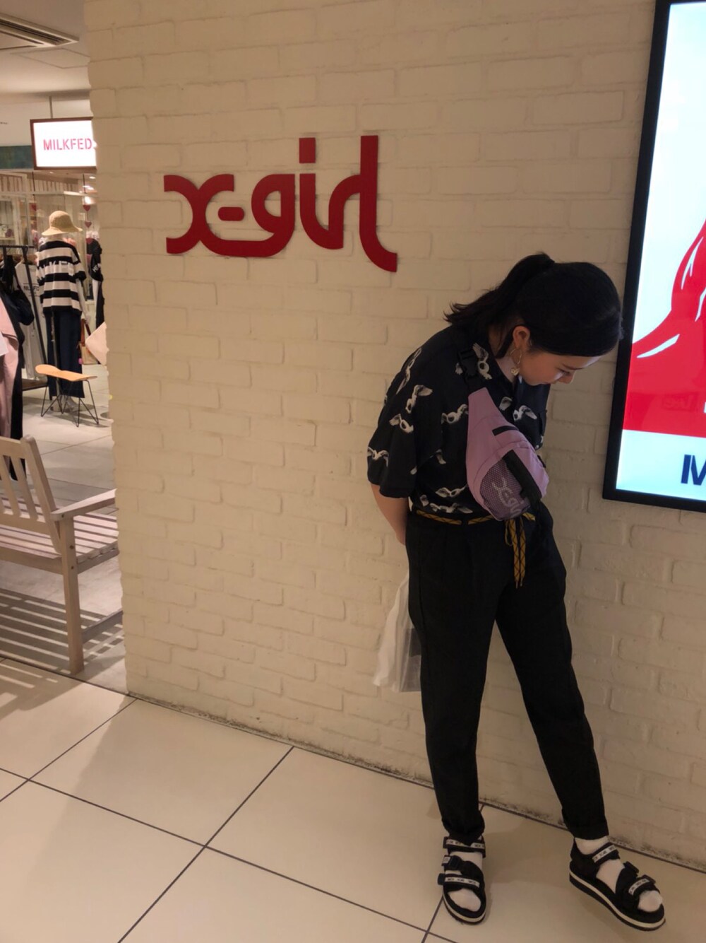 昨日のコーデ載せ直し失礼します!! X-girlコーデ 黒で統一しつつ、パープルのバックを 差し色に持ってきました!!