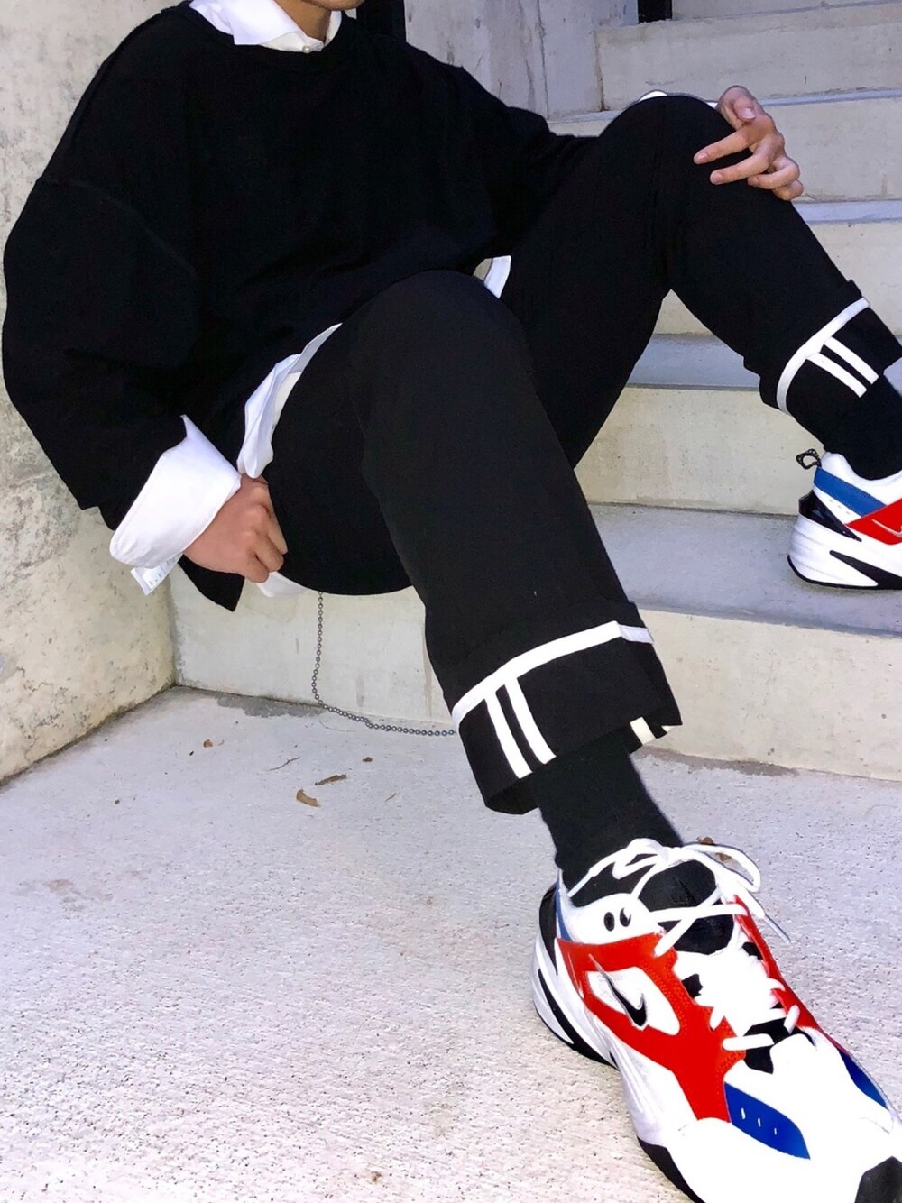 全身黒で固めると色味がなく面白く無いのでスニーカーやシャツで色味を足しました!このスニーカーは日本では発売しておらずレアなスニーカーで大変気に入っております😚