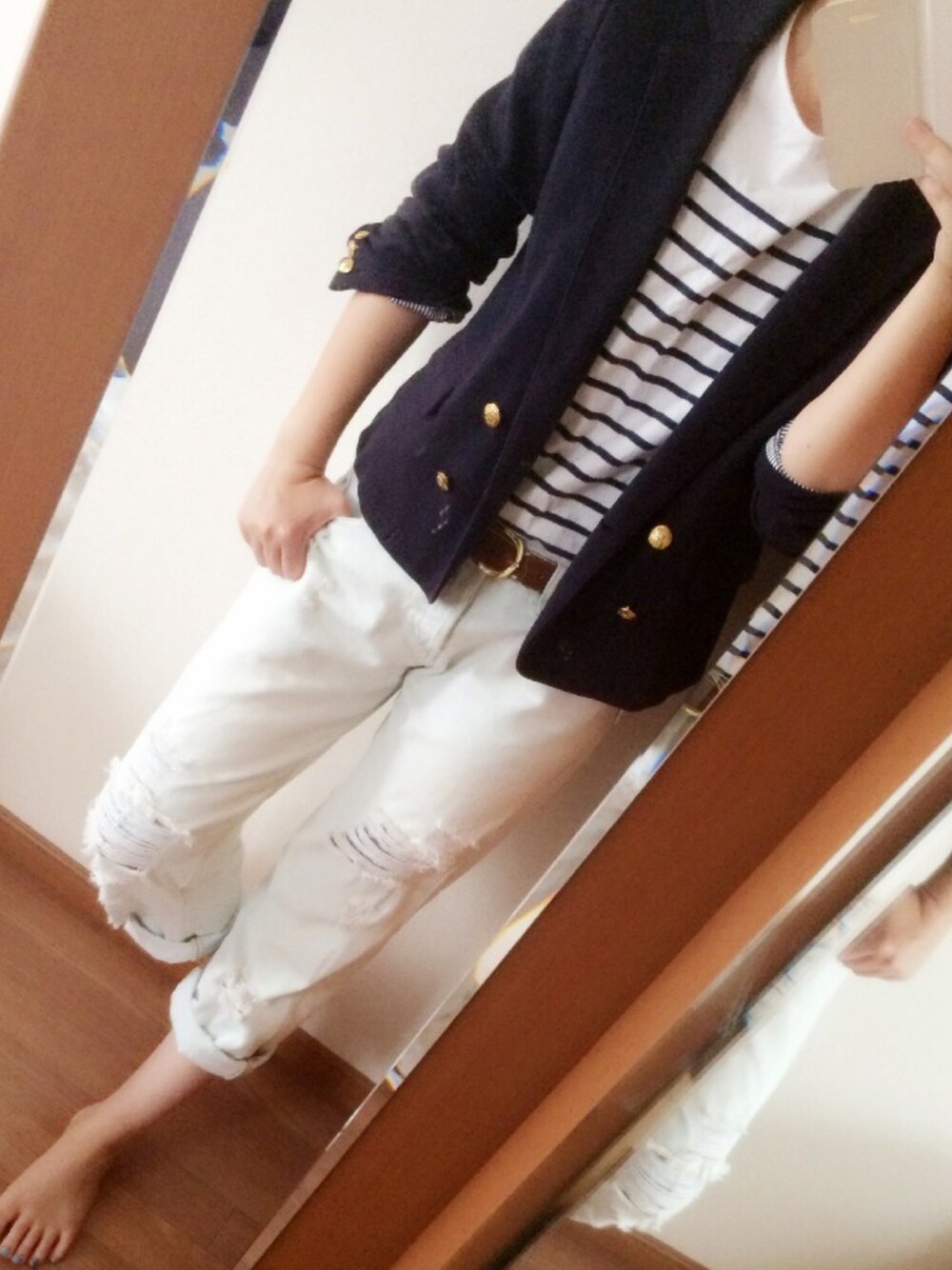 7月らしくないけど、 紺のジャケット袖まくり〜 まだ晩が寒いよね(._.)