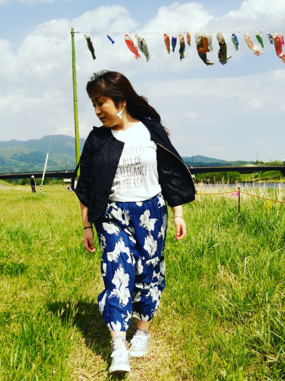 こんにちは👋😃 見て下さりありがとうございます☺ 今日は子供の日🎏 実家から少し離れた河川敷に こいのぼりいっぱい泳いでました☺ 鮮やかなブルーの花柄スカート トップスはシンプルにしてみました🌠 風がビュンビュンだったけど、 こいのぼりにはサイコーな風ですね✨