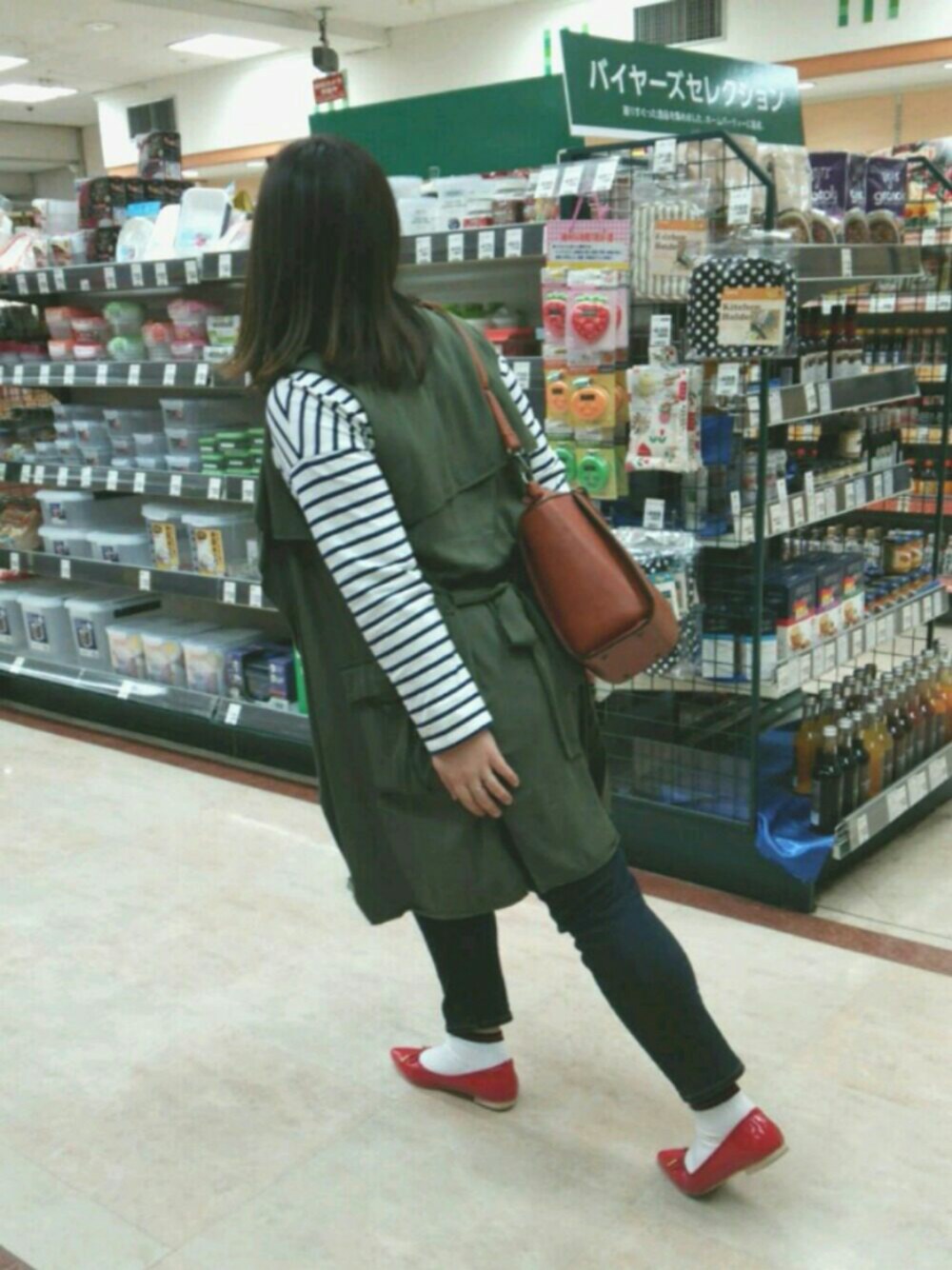 こんばんは🌛 今日は近所でお買い物👝 躍動感あります🎵 スーパーでお買い物🍎 天気も良くてボーダー👕にジレ