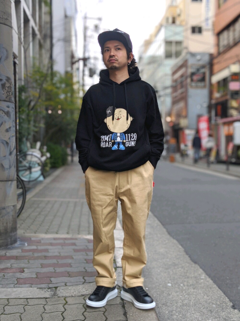 みね(ROYAL FLASH 上野店)のパーカー「【別注】20471120 × roarguns / トゥオーフォーセブンワンワントゥオー×ロアーガンズ/20SGB-RF1A/バックプリントフーディ」を使ったコーディネート